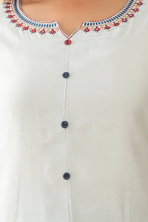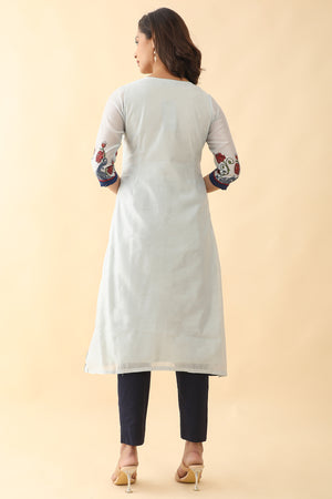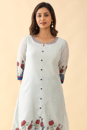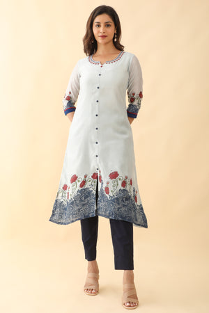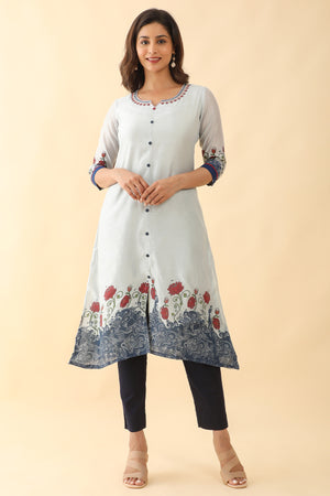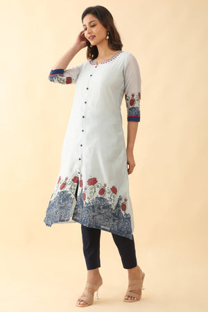 Contrast Floral Printed With Neck Embroidered Kurta Blue