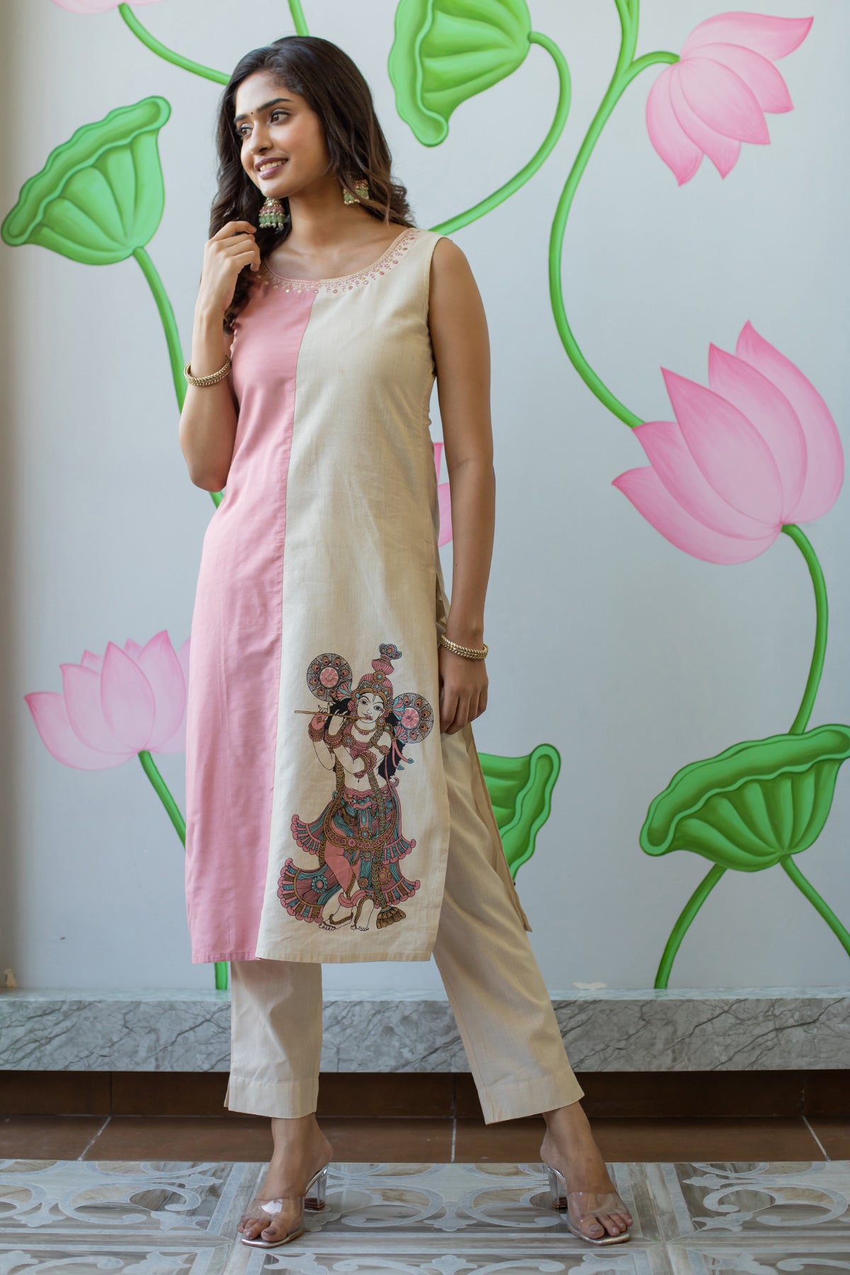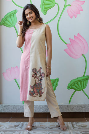 Foil Mirror With Mural Printed Color block Kurta -Peach