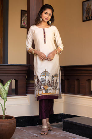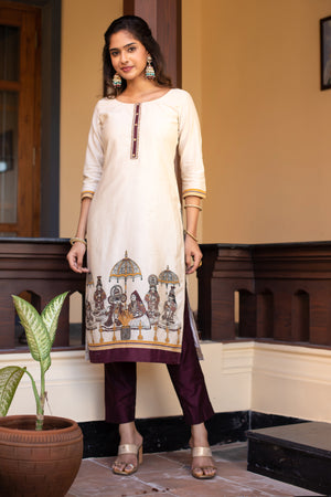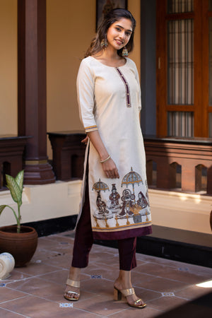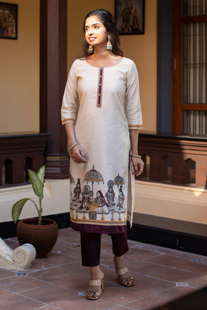 Geometric Motif Embroidered With Kathakali Inspired Placement Printed Kurta Brown