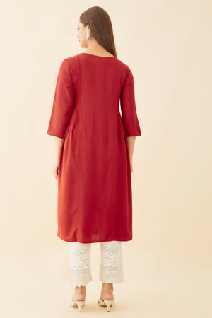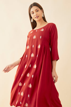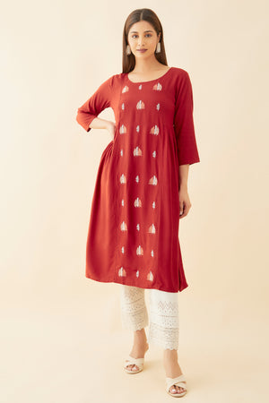 All Over Leave Motif Embroidered A Line Kurta Rust