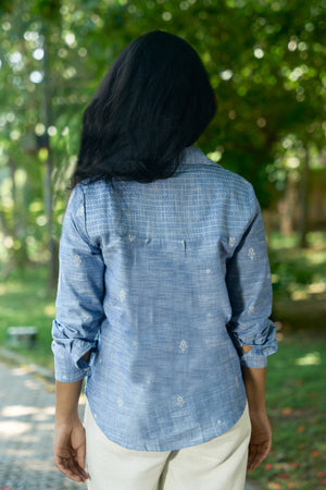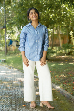 Stay stylish in this Blue cotton slub Shirt with dobby design. Features collar neck, full sleeves, and front button closure. Lightweight, breathable, and perfect for work or casual outings.