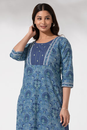 This blue kurta pant set features elegant floral prints and a detailed yoke. Summer-friendly, breathable, and perfect for effortless office or everyday wear with a polished look.