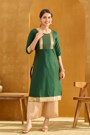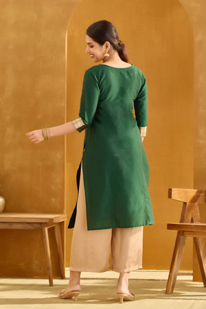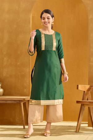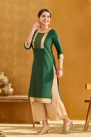 Bottle Green Straight Kurta with Golden Embroidery