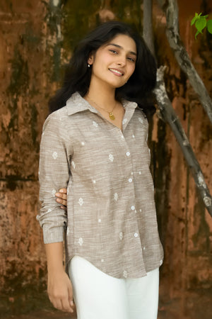 Elevate your everyday style with this brown cotton dobby tunic. Featuring a classic collar neck, full sleeves, and front button closure, it blends comfort with elegance—perfect for casual outings or office wear, with a subtle touch of Indian roots.