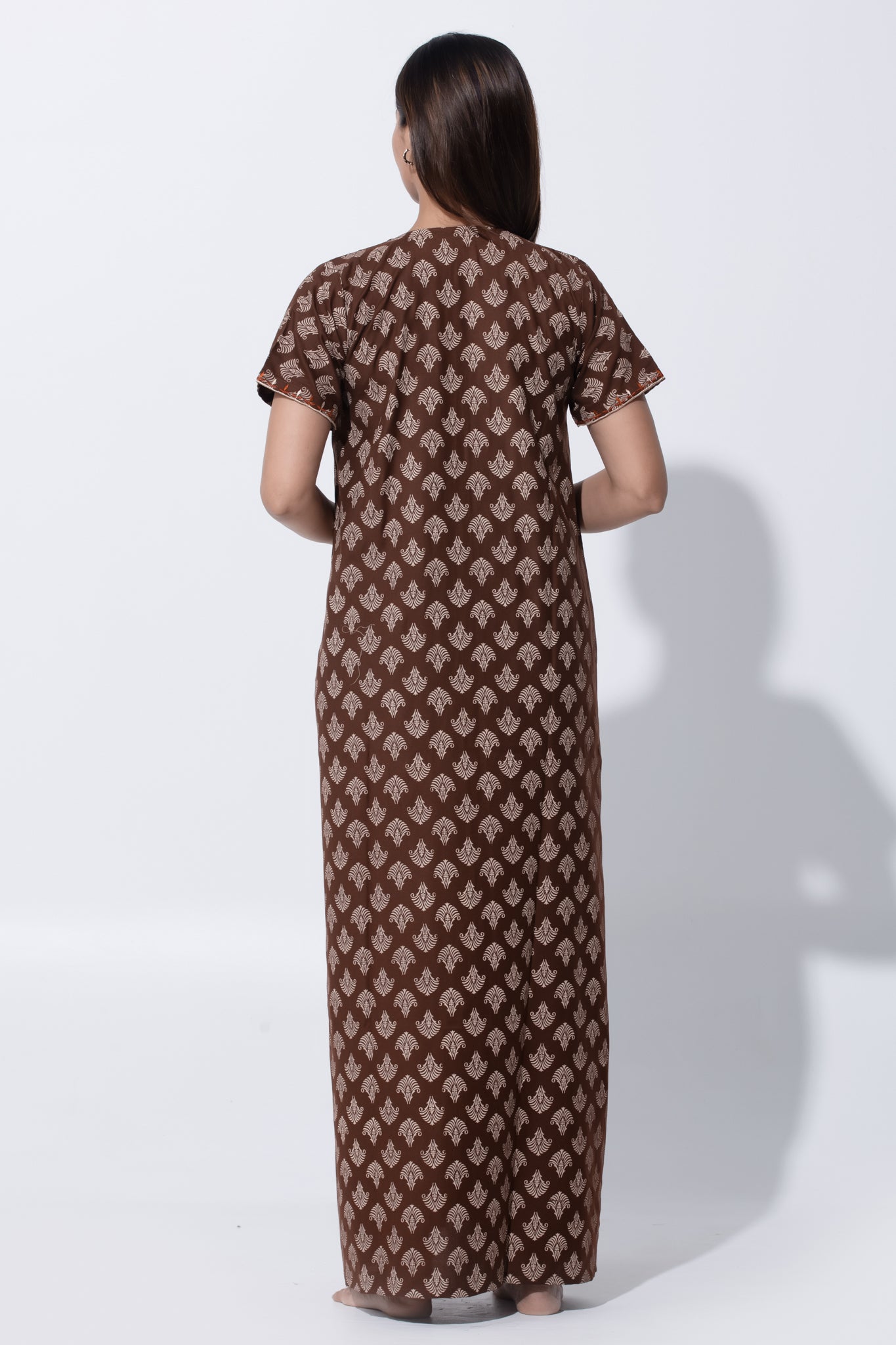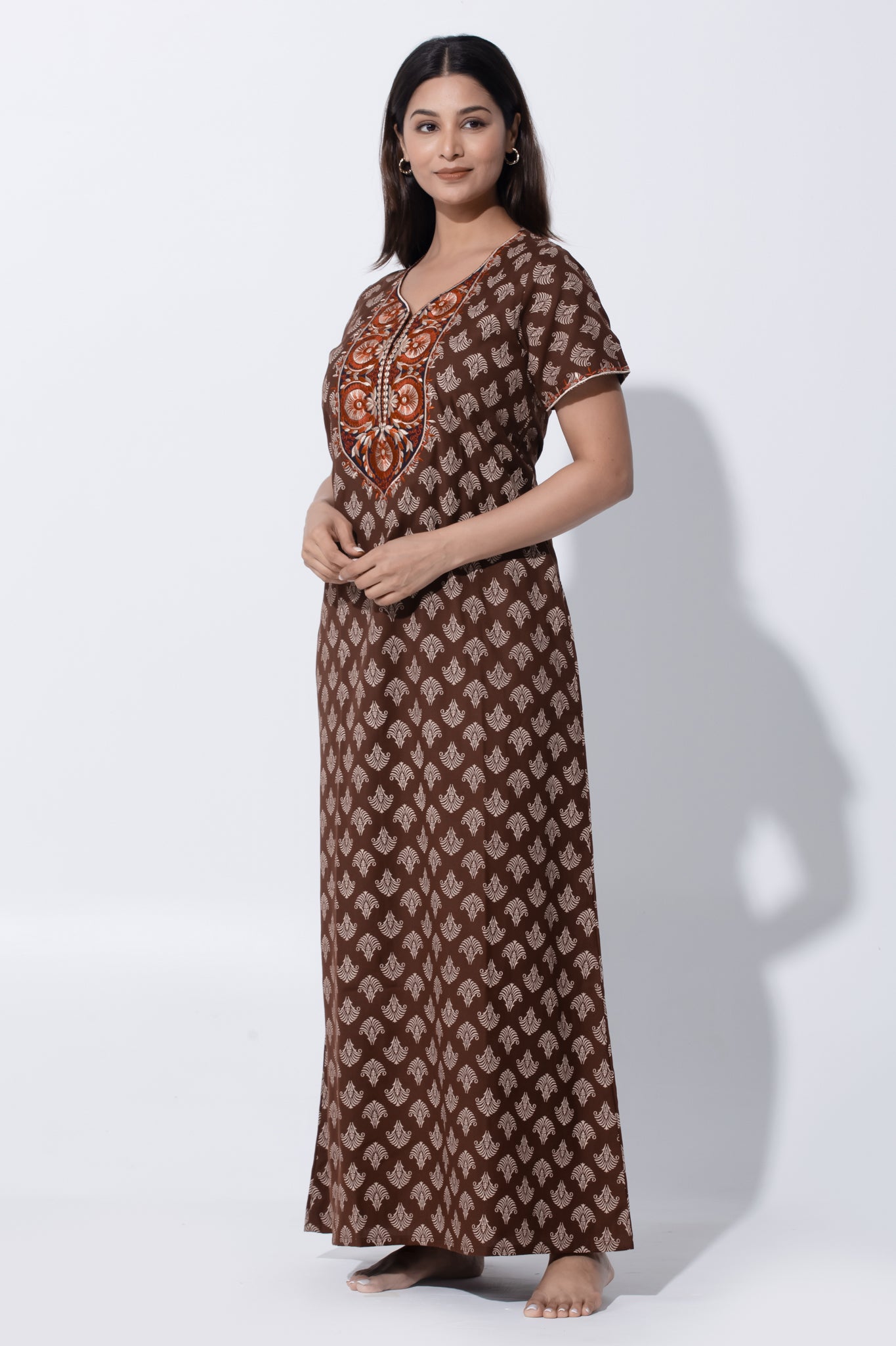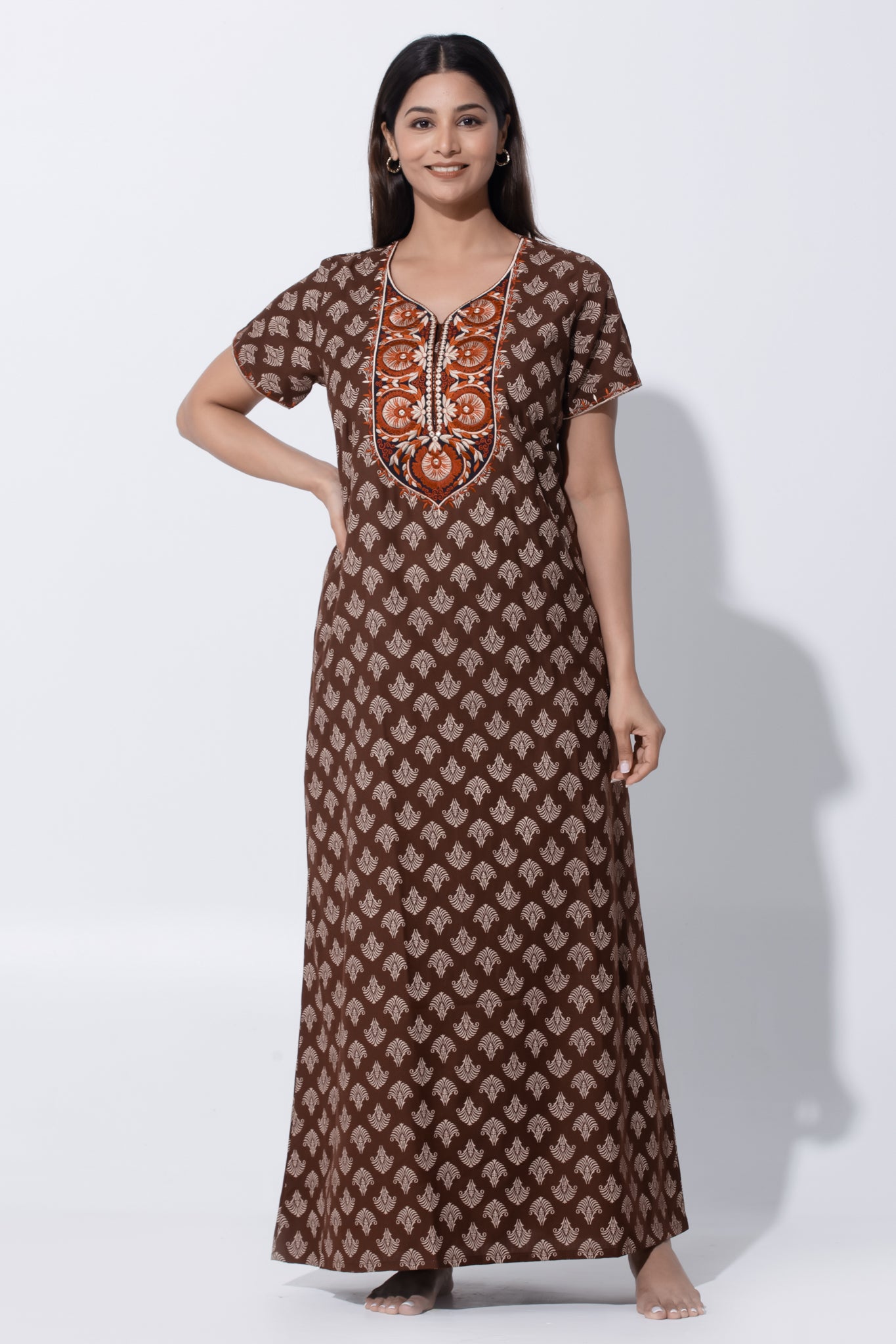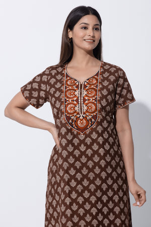 Elegant Brown polycotton nightwear featuring all-over motif prints, embellished embroidered yoke, and foil mirror detailing. Soft, breathable, and designed for stylish all-night comfort.