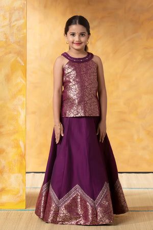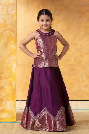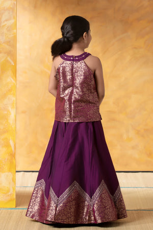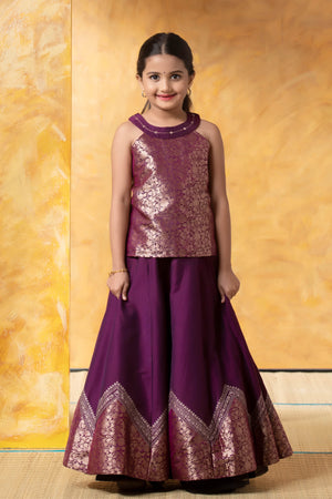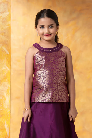 Burgundy Kids Skirt Set with Brocade Halter Top & Paneled Skirt