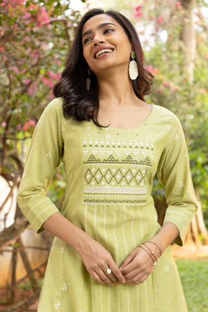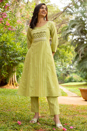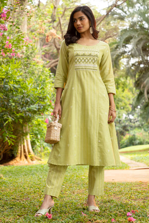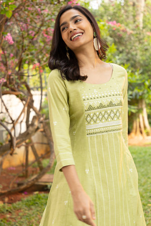 Dobby Weave Monochrome KurtaSet with Embroidered Yoke - Green