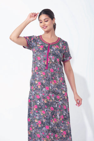 Black digital printed nighty crafted in soft viscose, featuring a front zipper closure for easy wear and feeding-friendly access, accented with an embroidered neckline and delicate lace embellishment—perfect blend of comfort and elegance.