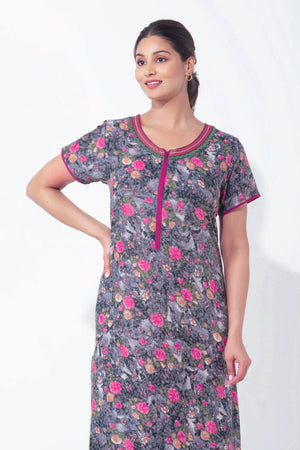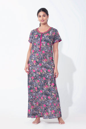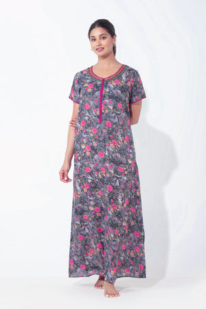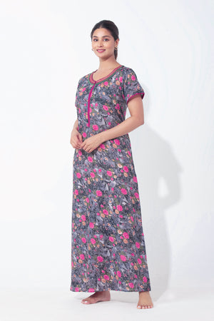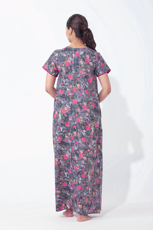 Digital Floral Printed Black Nighty with Front Open Zipper