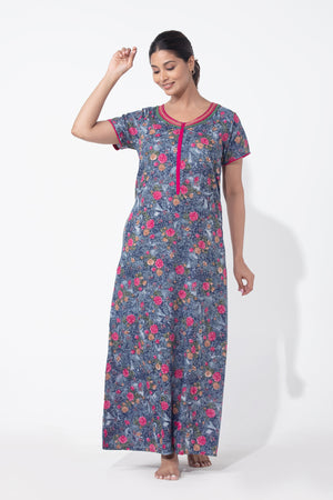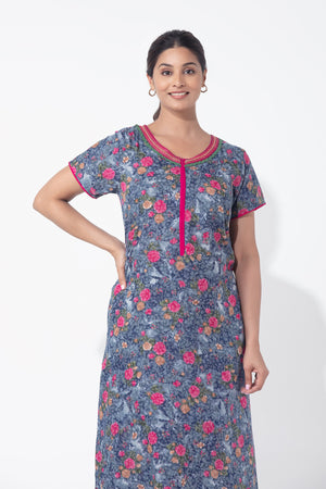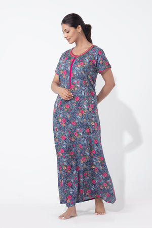 Blue digital printed nighty crafted in soft viscose, featuring a front zipper closure for easy wear and feeding-friendly access, accented with an embroidered neckline and delicate lace embellishment—perfect blend of comfort and elegance.