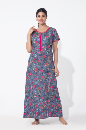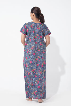 Digital Floral Printed Blue Nighty with Front Open Zipper