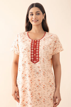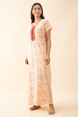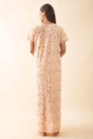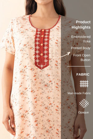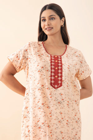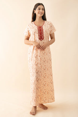 Ditsy Floral Printed Nighty with Embroidered Yoke - Peach