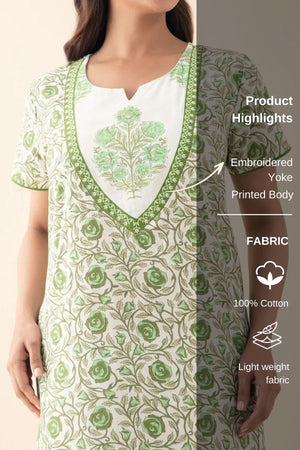 Floral Embroidered & Printed Nighty - Green