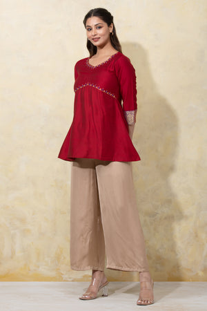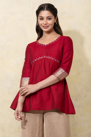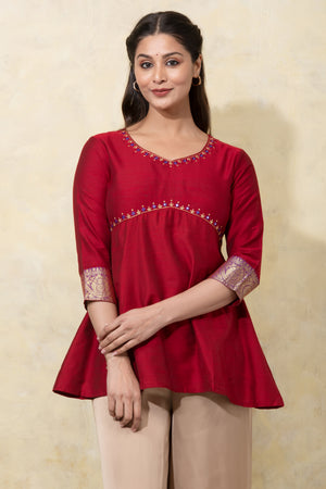 Floral Embroidered Yoke Pachwork Tunic - Red