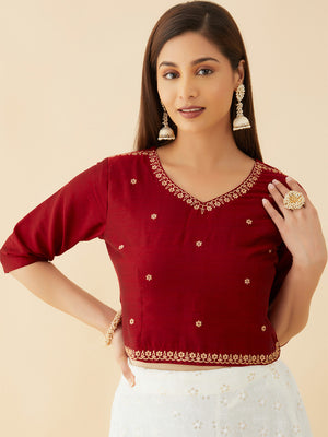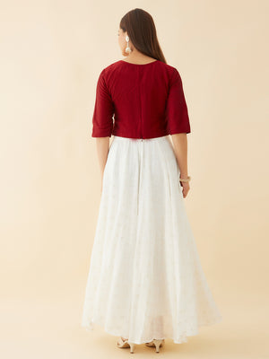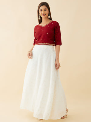 This Floral Motif Embroidered Crop Top Sequin Embellished Skirt Set Red White Skirt set will have you turning heads at any event. Perfect for a special occasion, this set is a must-have in any fashion-forward wardrobe.