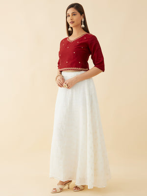 Floral Motif Embroidered Crop Top Sequin Embellished Skirt Set Red White