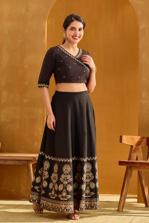 Black paneled silky slub skirt with lining, enhanced with elegant gold placement floral prints for a chic festive look. Designed with a drawstring and back elastic for a regular fit — skirt only, top shown is for styling and sold separately.