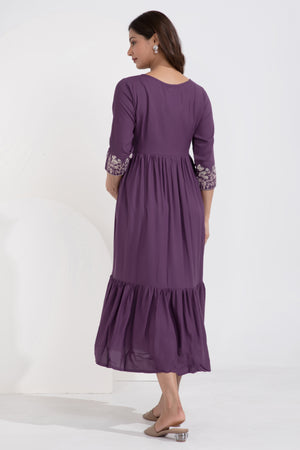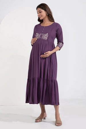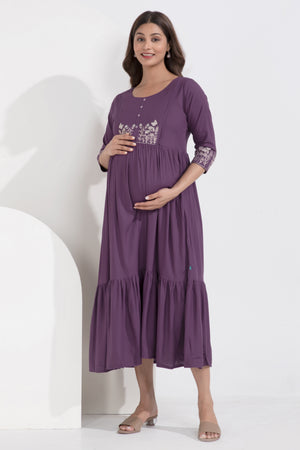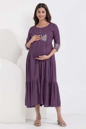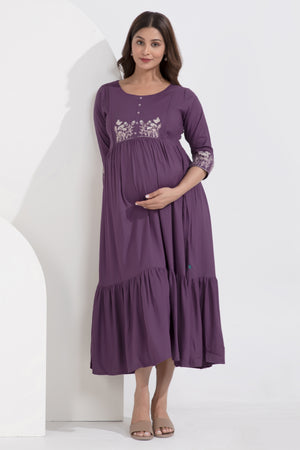 Floral Embroidered Pleated Purple Maternity Long Dress