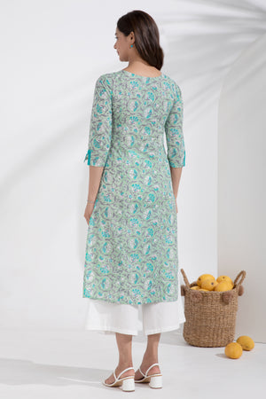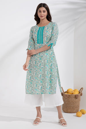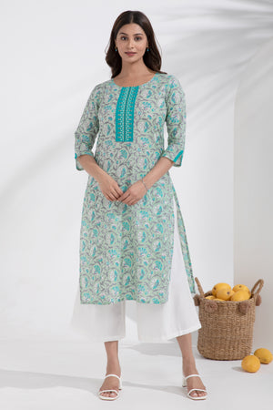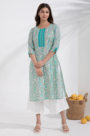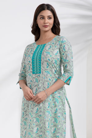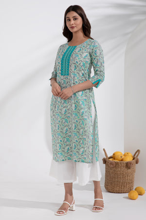 Floral Printed & Embroidered Cotton Turquoise Kurta