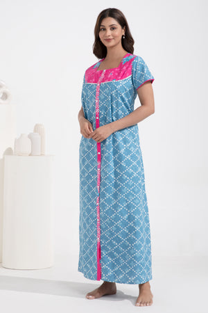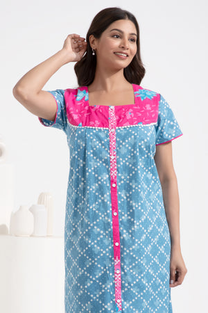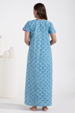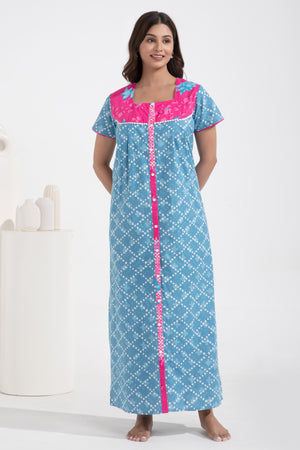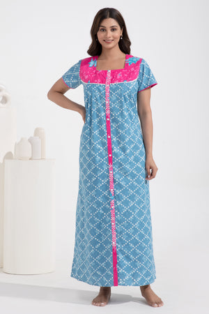 Floral Printed Front Open Blue Cotton Nighty
