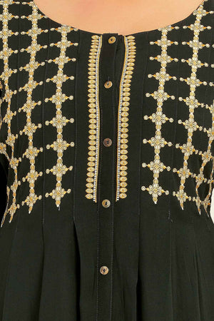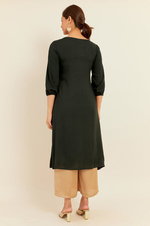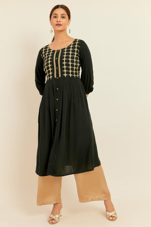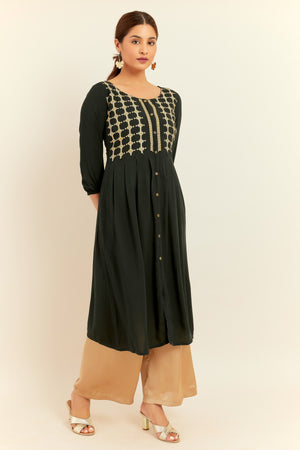 Geometric Embroidered Check Pattern Yoke With Solid Kurta Green