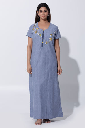Gray Floral Embroidered Pure Cotton Nightwear with Button