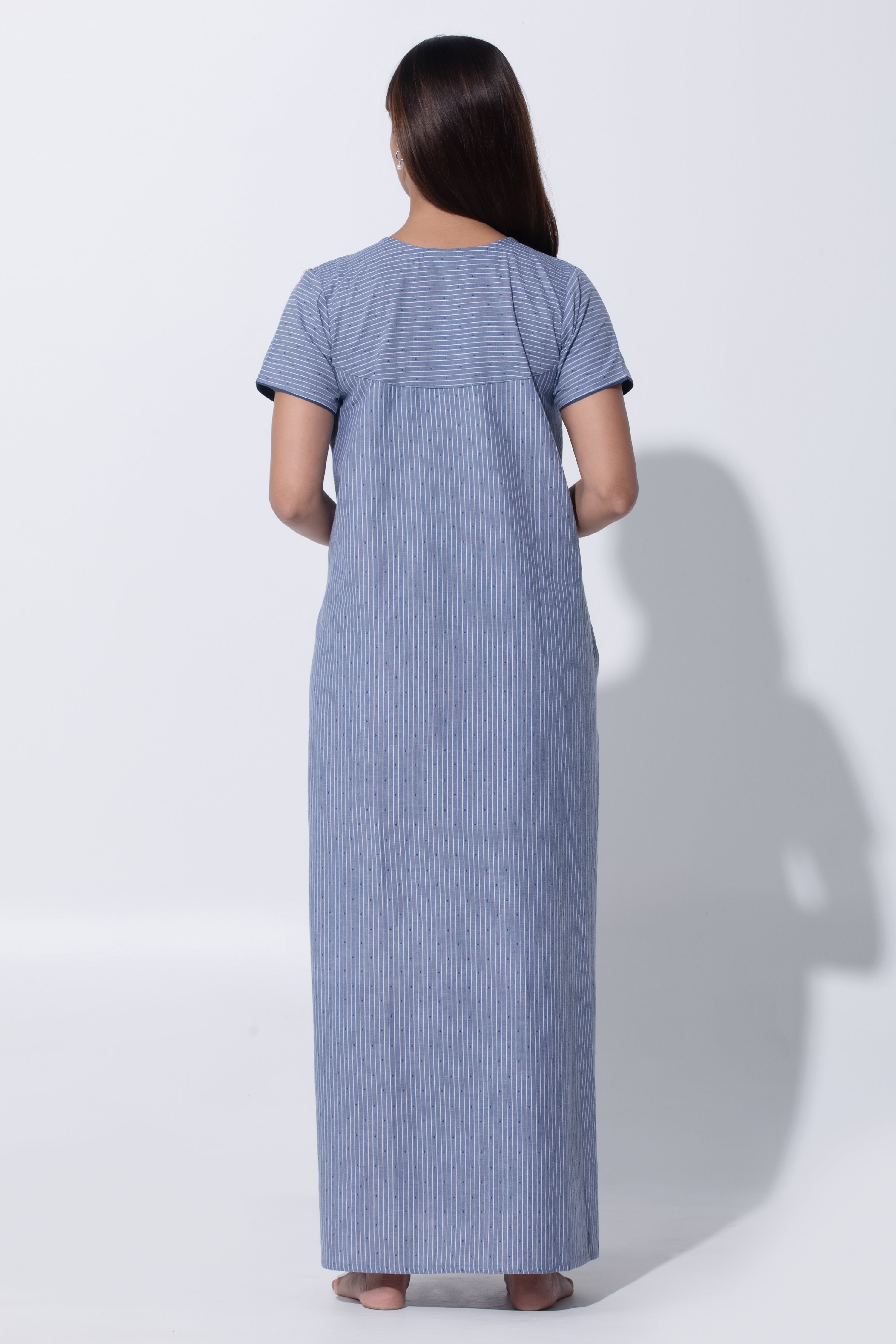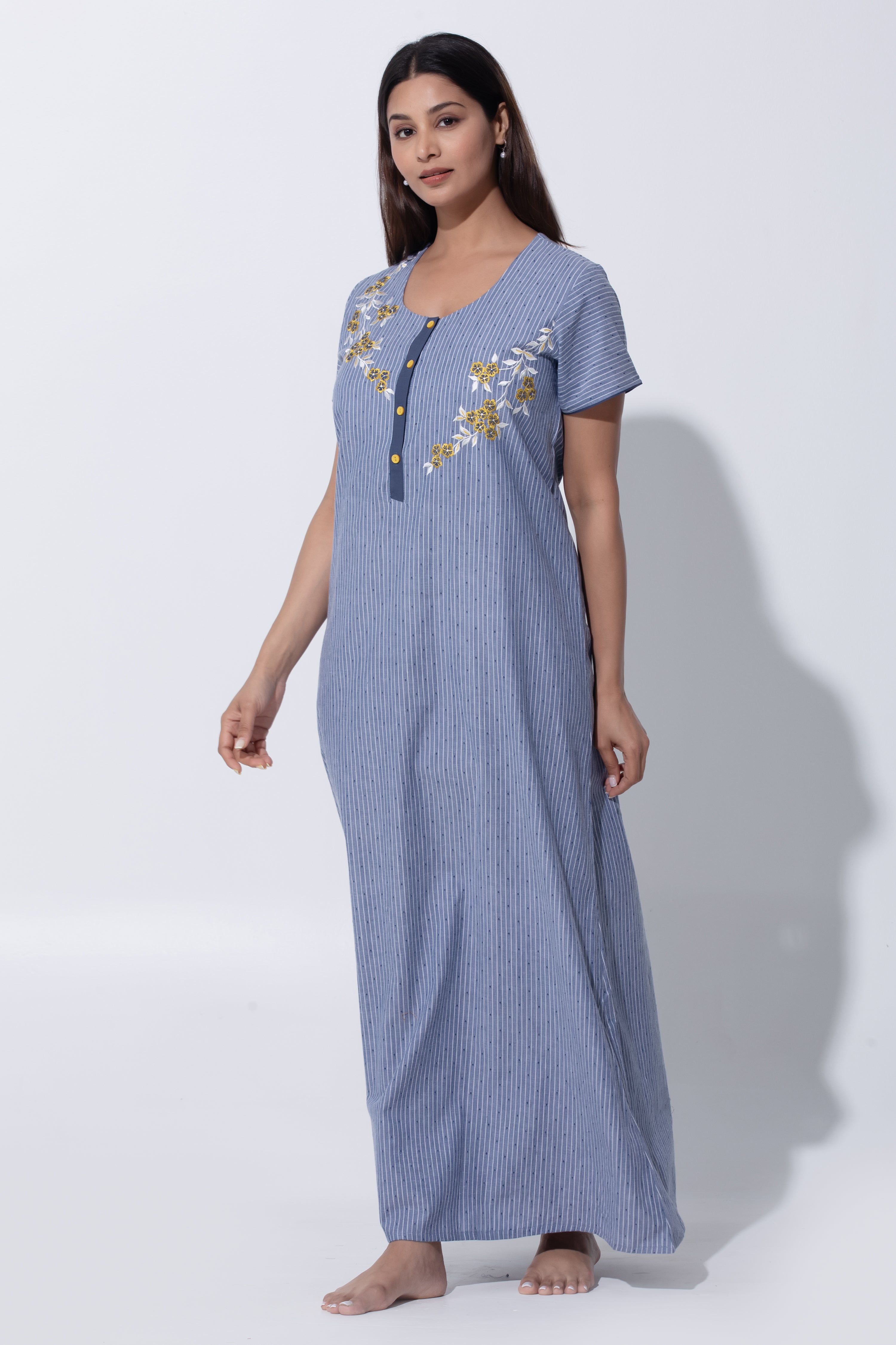 Soft gray pure cotton nightwear with floral embroidery and square weave design. Features functional buttons, making it perfect and comfortable for breastfeeding new moms.