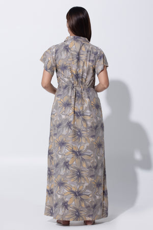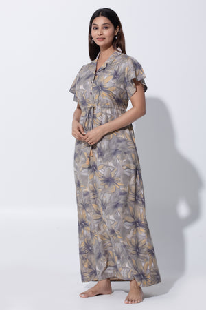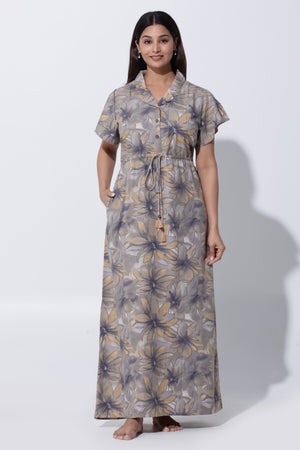 Gray & Yellow Printed Nighty with Adjustable Waist Tie