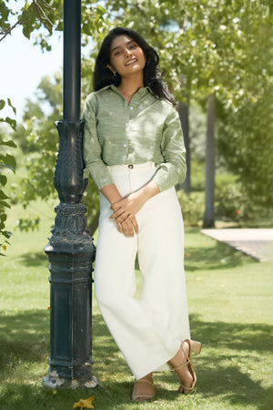 Stay stylish in this green cotton slub Shirt with dobby design. Features collar neck, full sleeves, and front button closure. Lightweight, breathable, and perfect for work or casual outings.