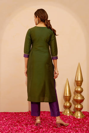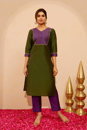 Floral Embroidered Kurta with Contrast Yoke - Green