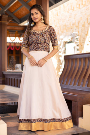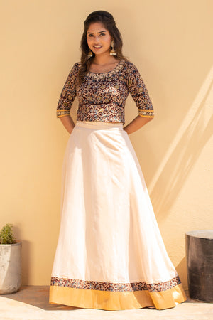 Kalamkari With Floral Embroidered Crop Top Solid Skirt Set Brown Off White