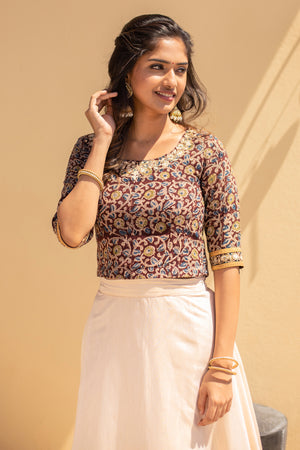 Experience the perfect blend of traditional and contemporary with Maybell's Kalamkari Floral Embroidered Crop Top and Solid Skirt Set. The floral embroidery adds an elegant touch to the rich brown and off-white color combination.