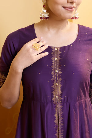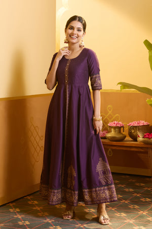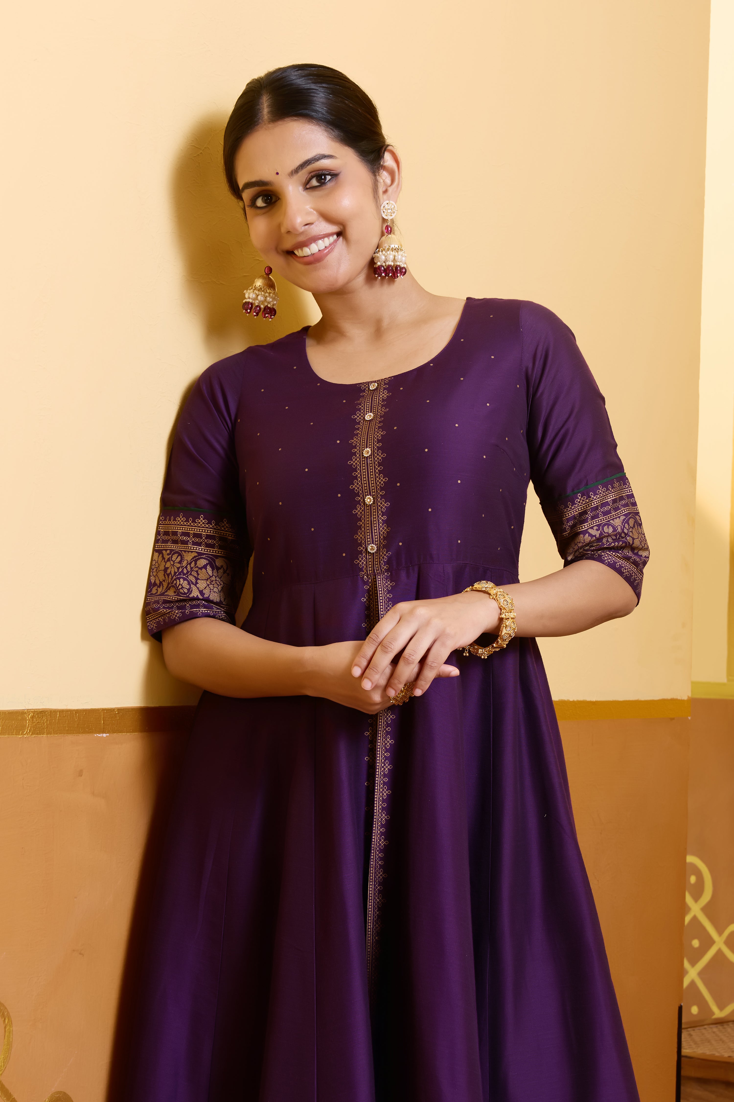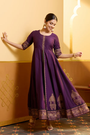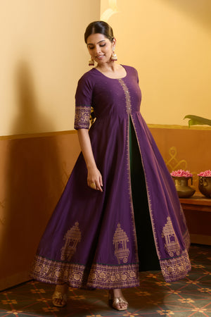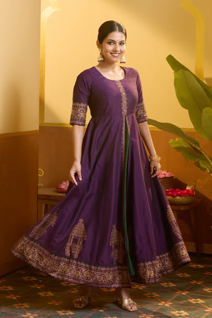 Kolam Printed Purple & Green Anarkali with Front Slit