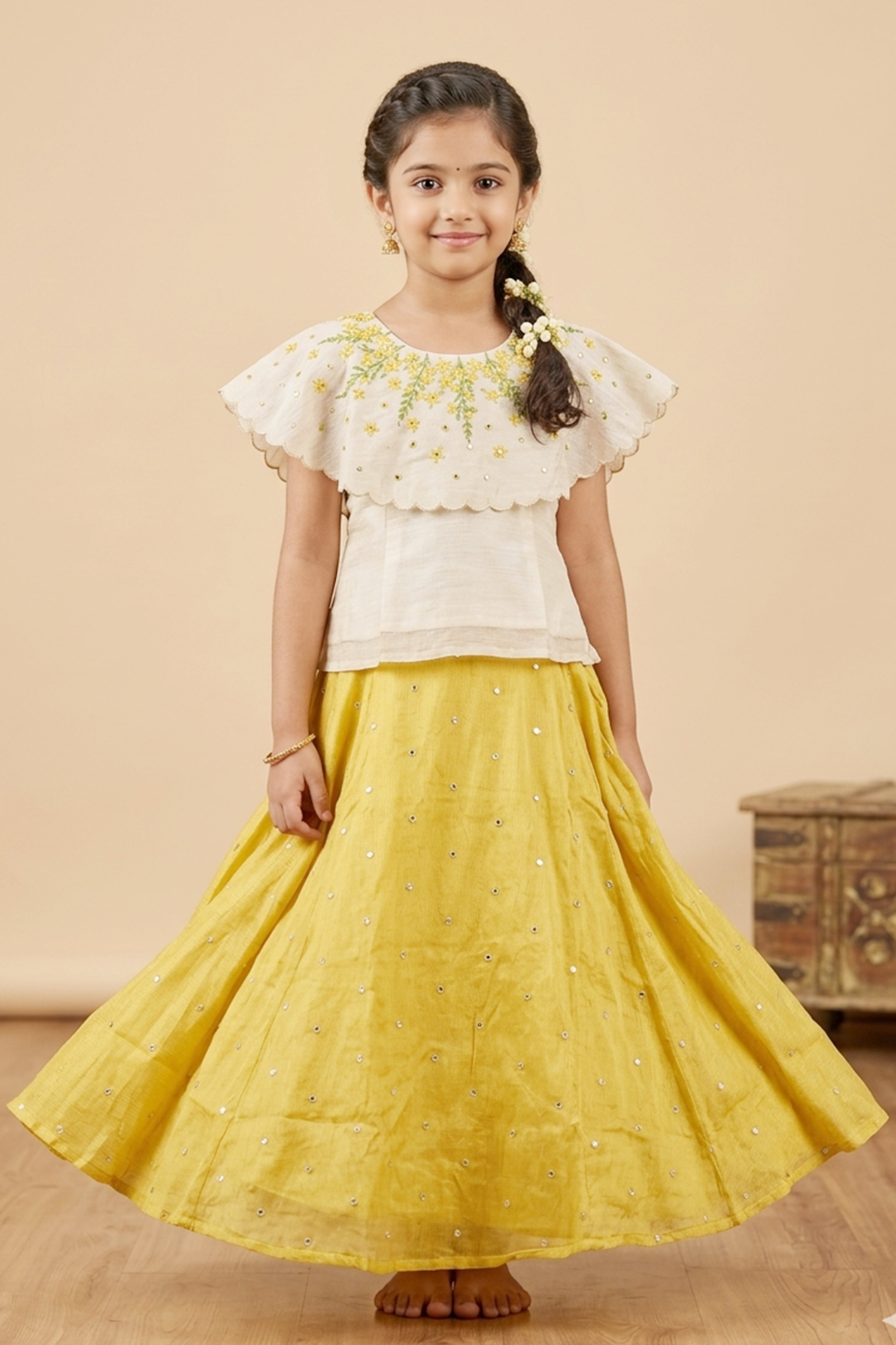Off White Floral Top & Yellow Mirror Skirt Set