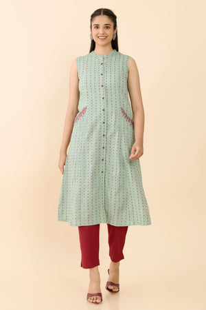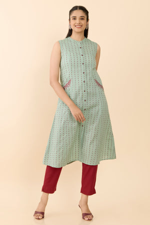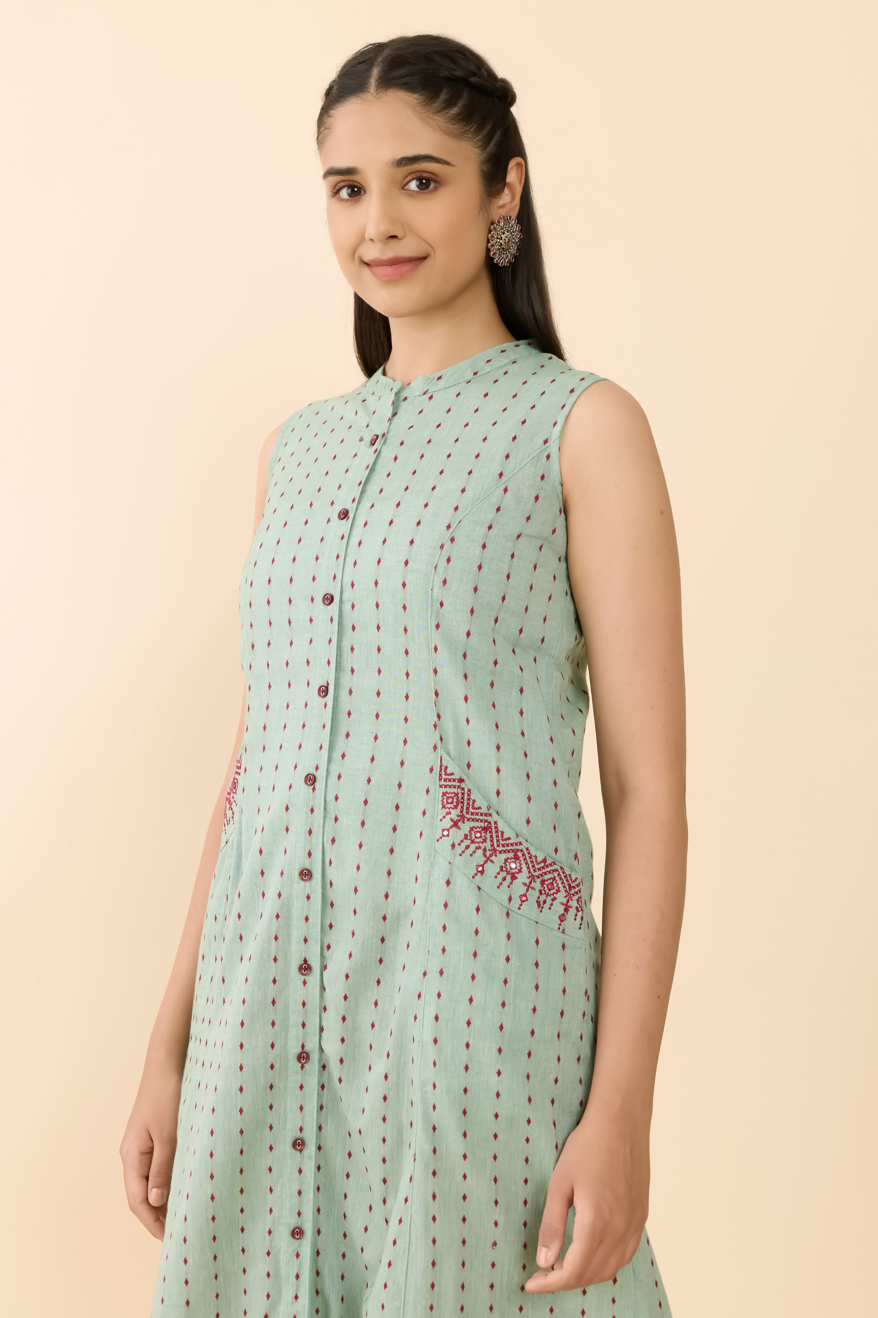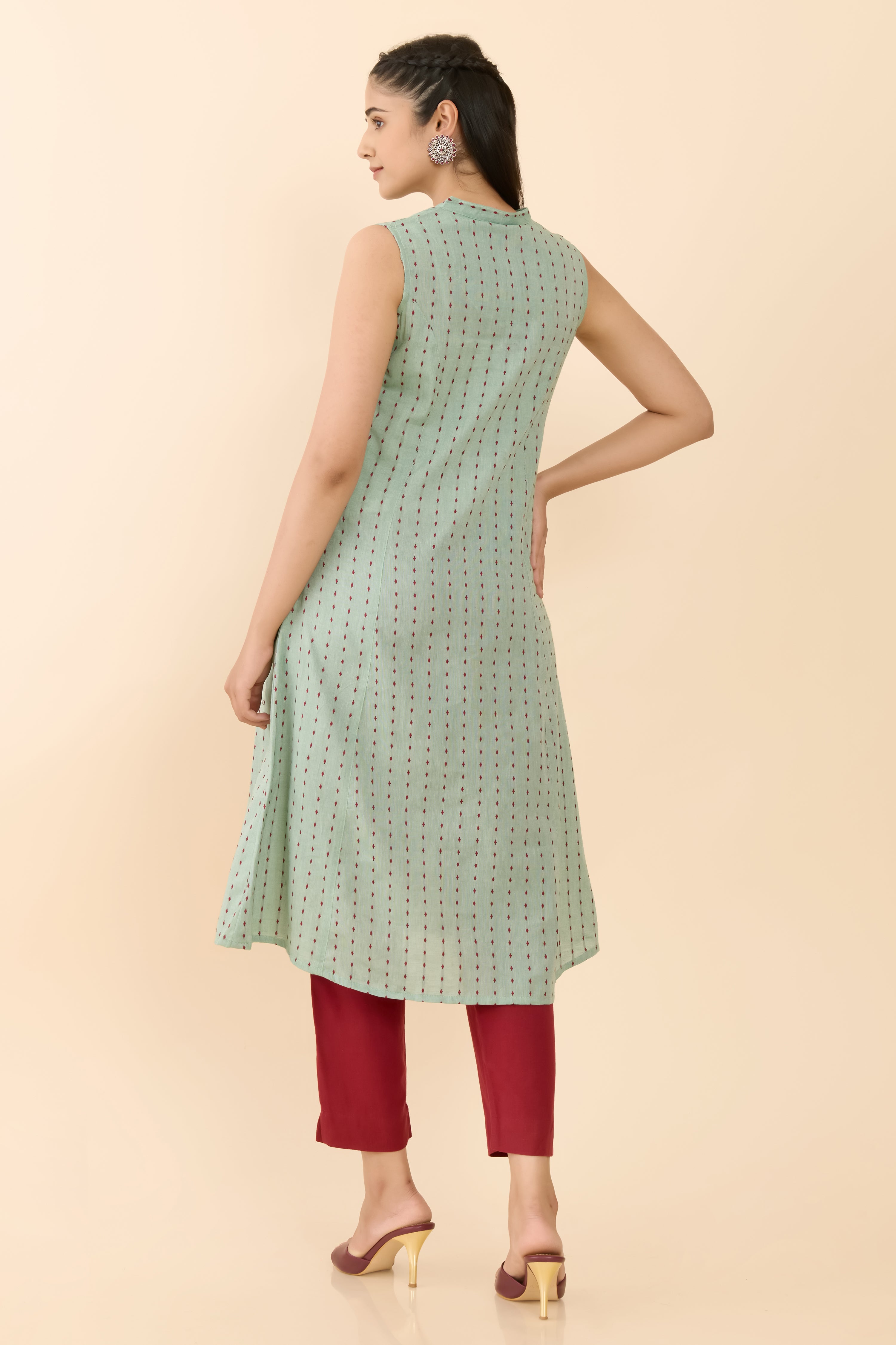 Mint green cotton flex kurta detailed with delicate dobby weave in a straight-cut silhouette with a slant placket. Featuring a Chinese collar with a functional front open button placket and a sleeveless design for a light, easy feel.