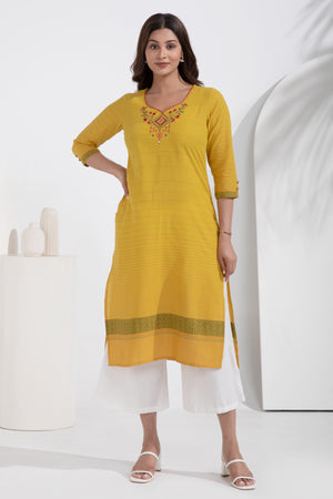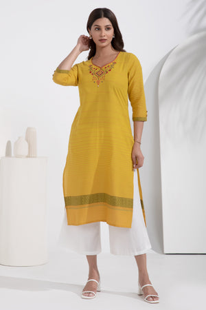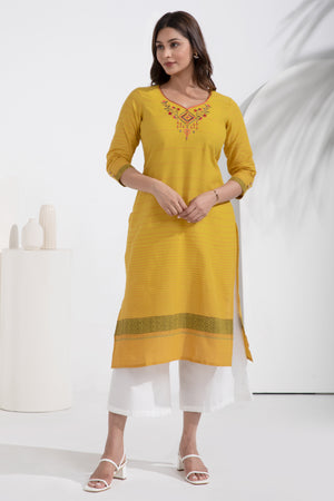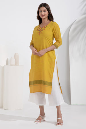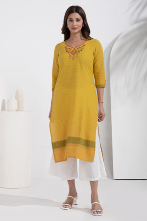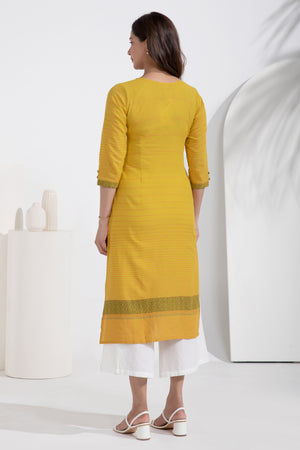 Cotton Dobby Mustard Floral Embroidered Kurta