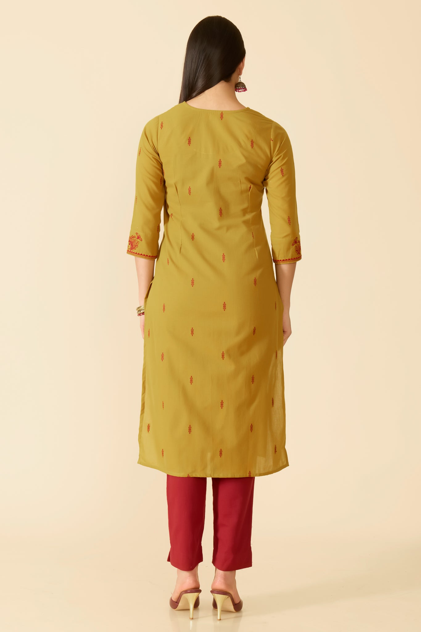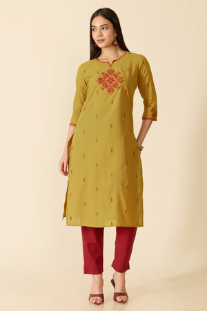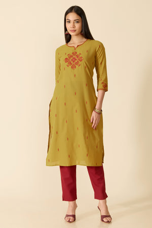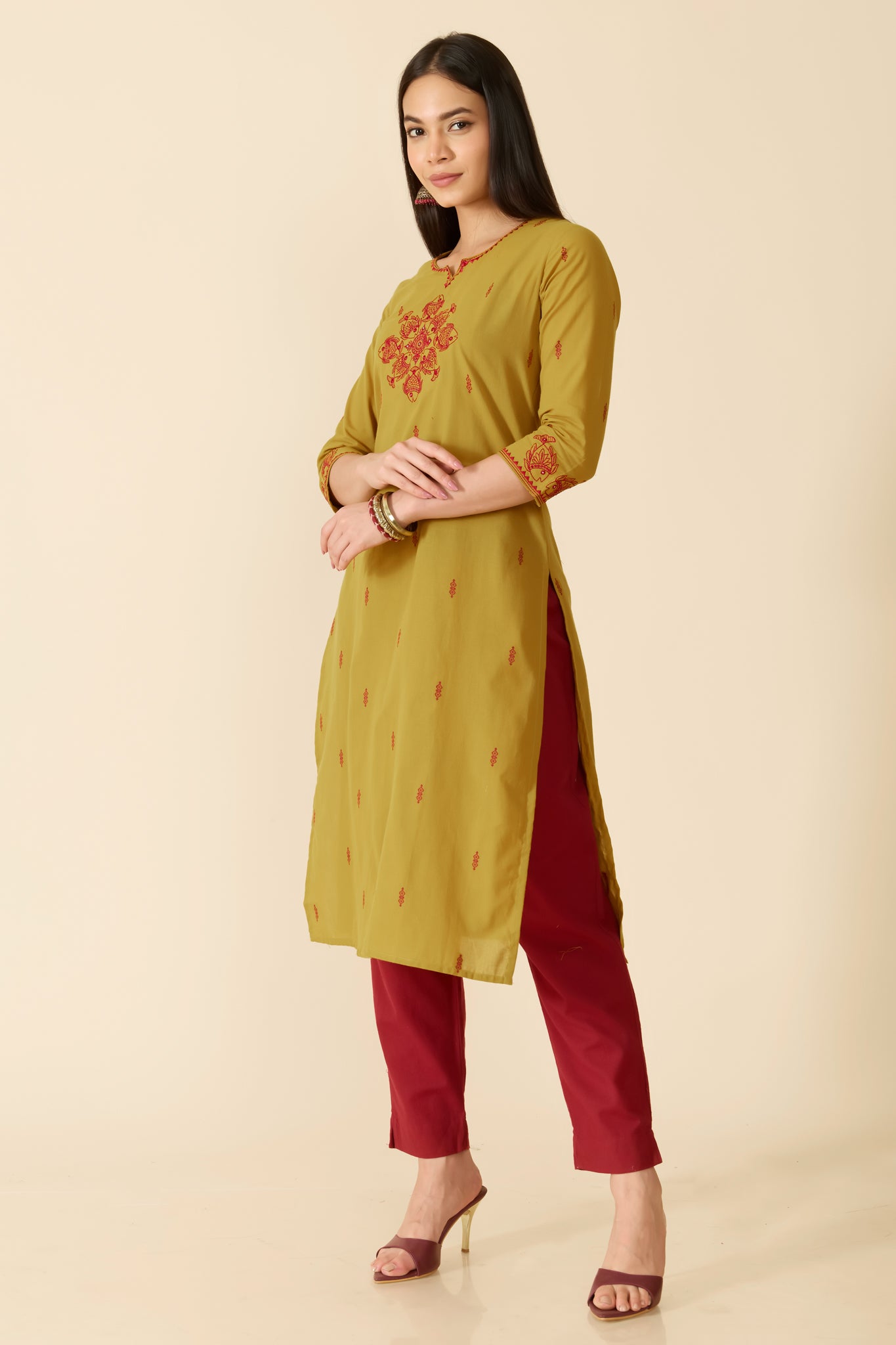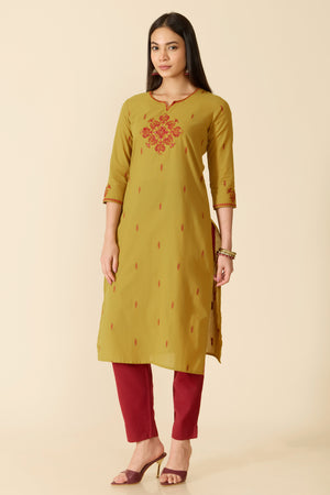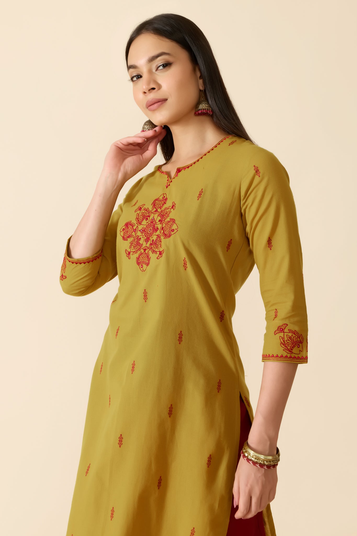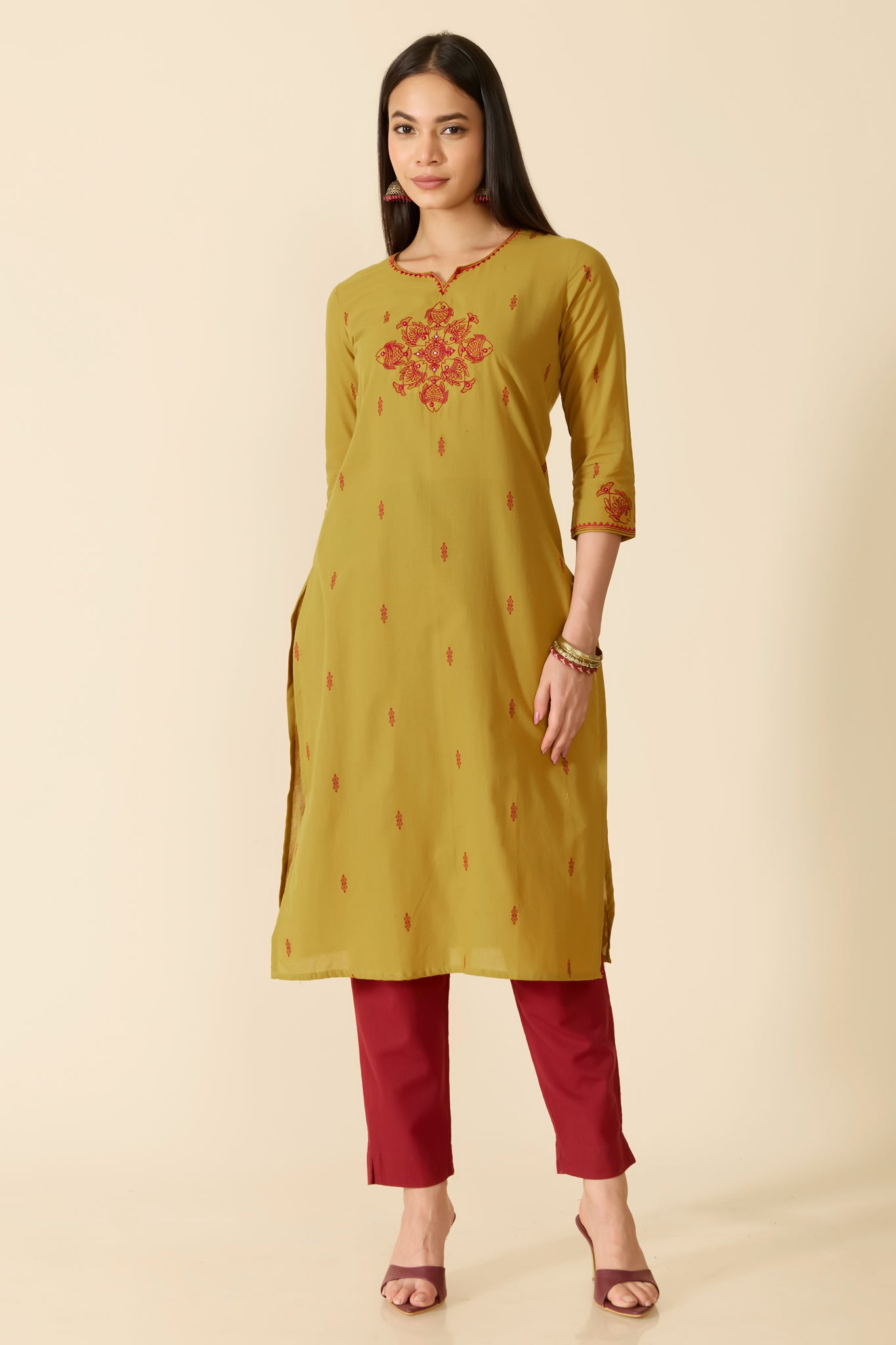 Mustard cotton blend kurta elevated with delicate embroidery and a flattering V-notch neckline. A timeless everyday staple—easy, elegant, and ready to wear wherever you go.