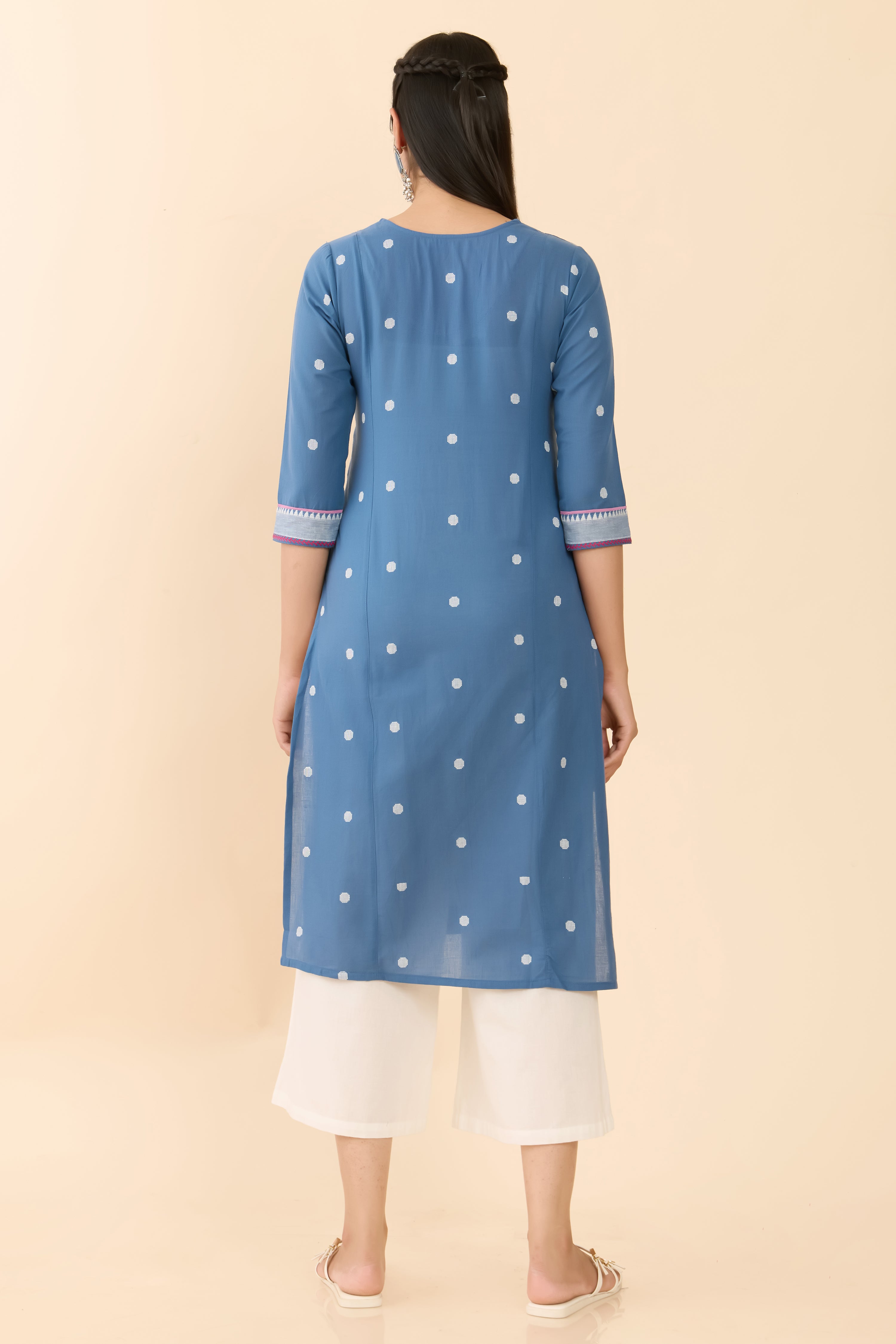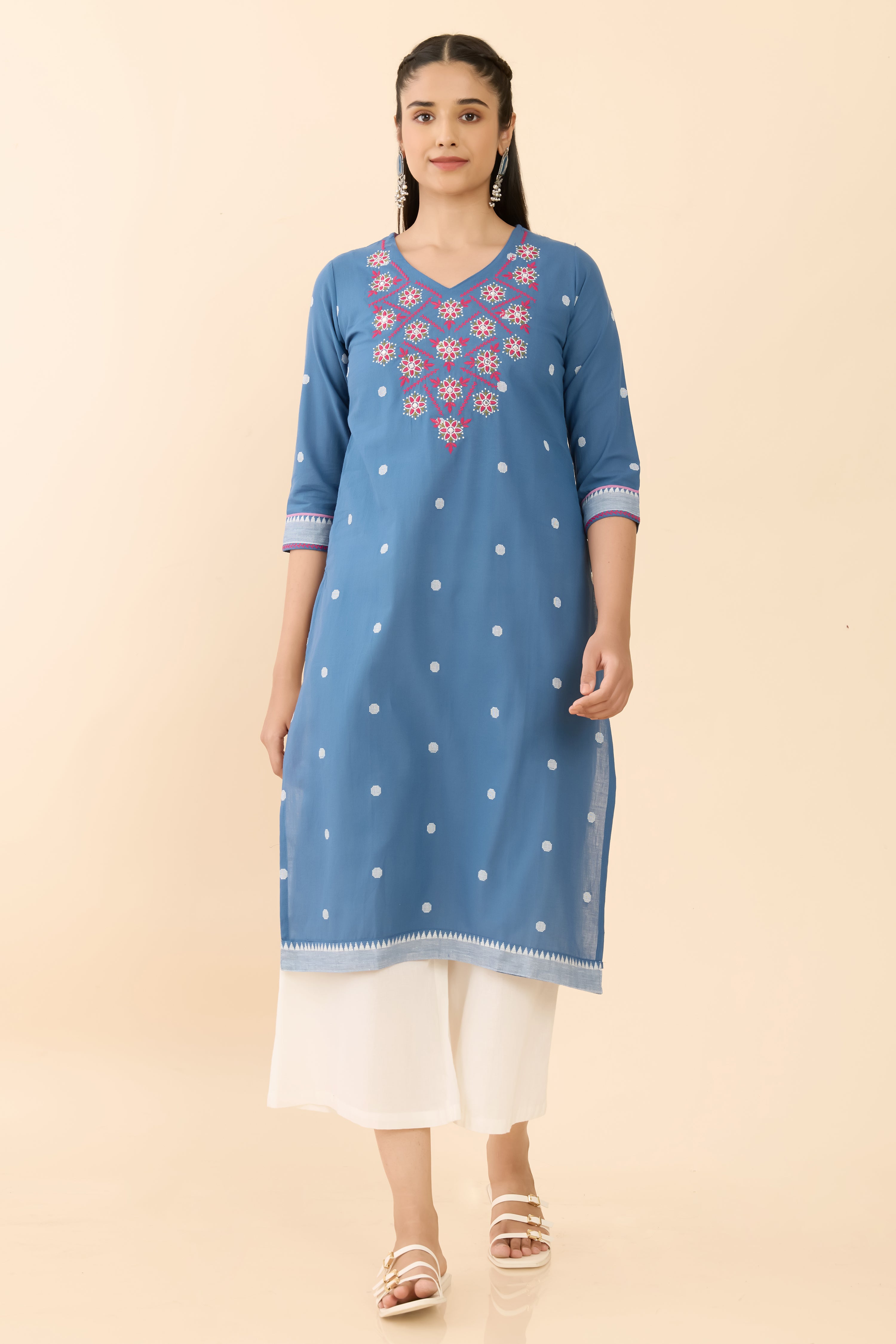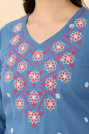 Blue cotton kurta detailed with delicate floral embroidery and subtle butta motifs in a straight-cut silhouette. Featuring a V-neckline, 3/4th sleeves, and breathable fabric for effortless everyday comfort.