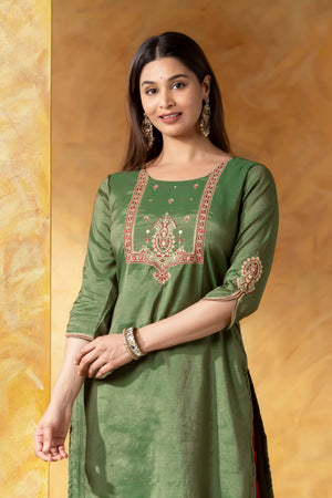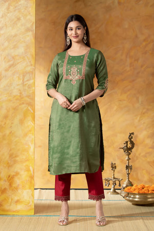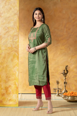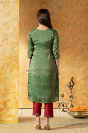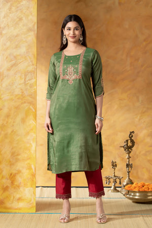 Green Straight Kurta with Golden & Red Embroidered Yoke
