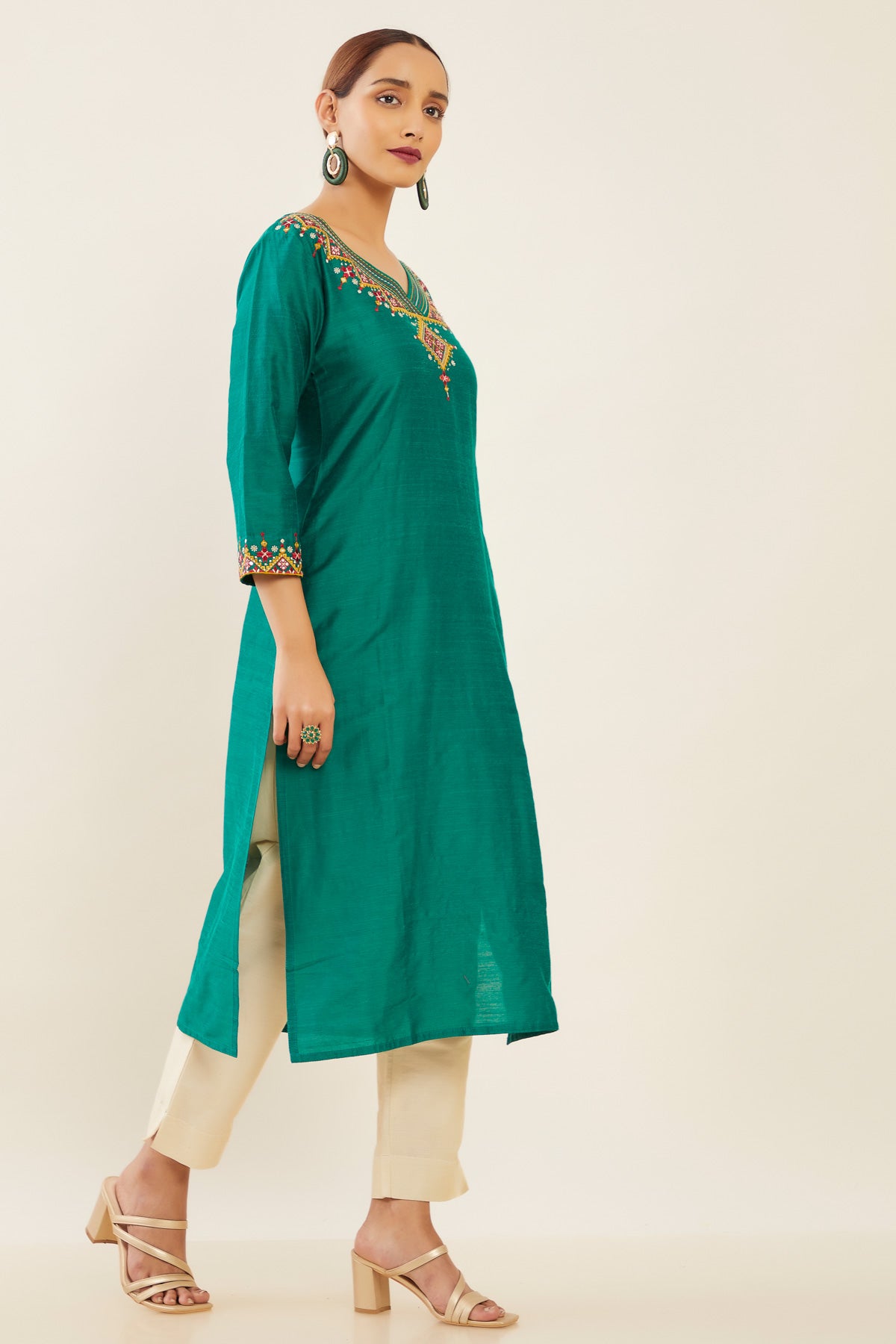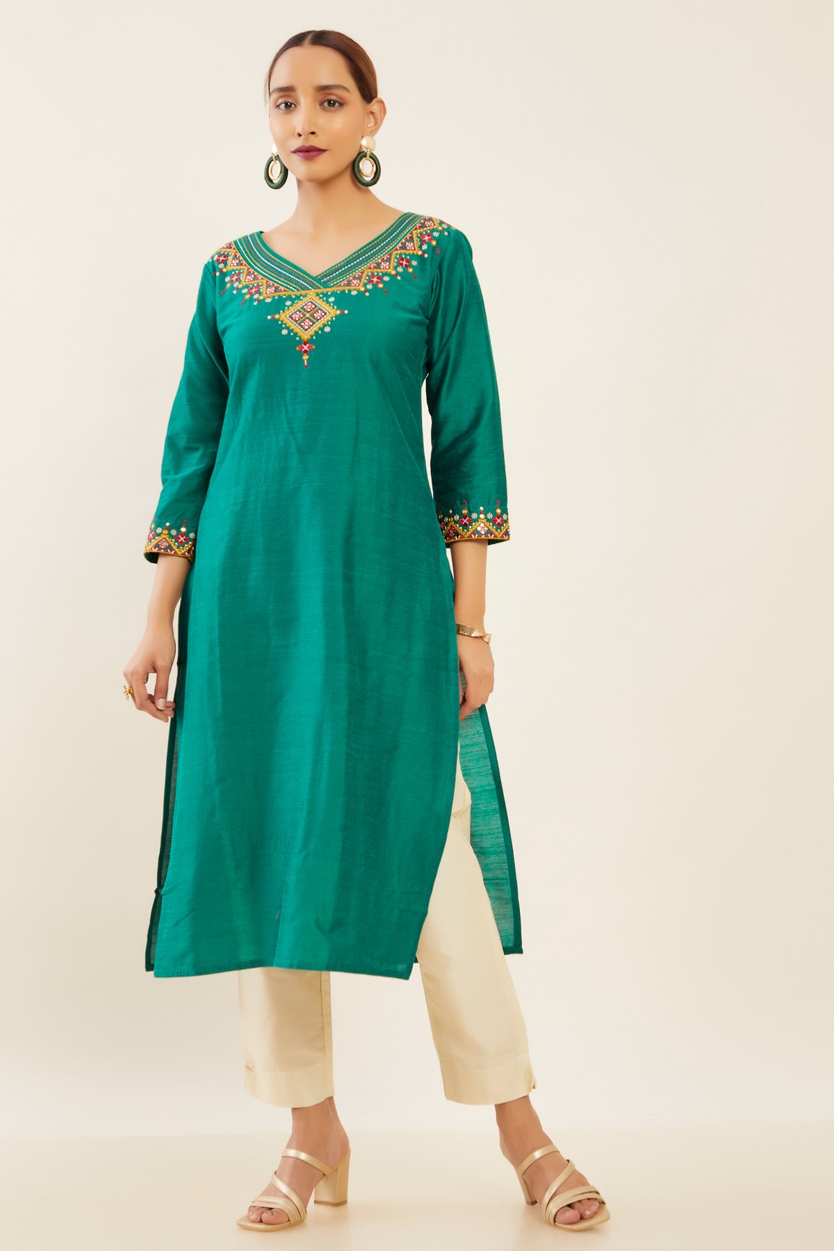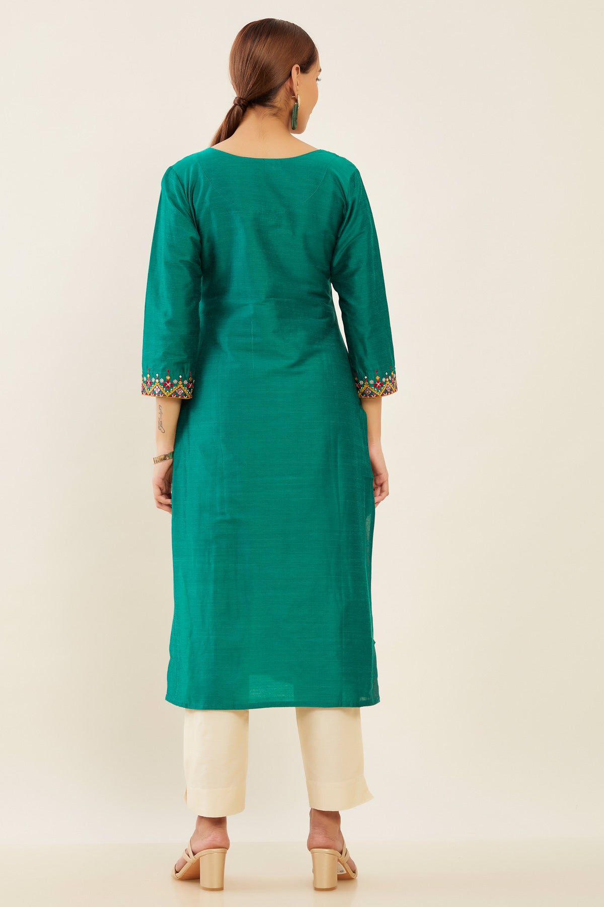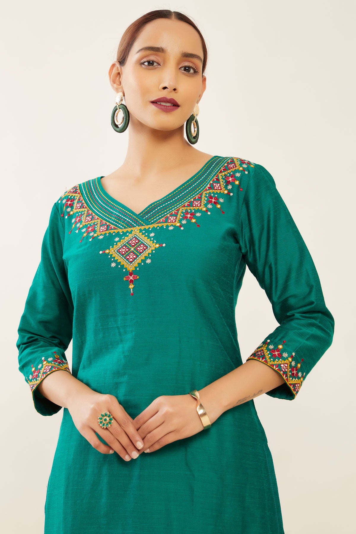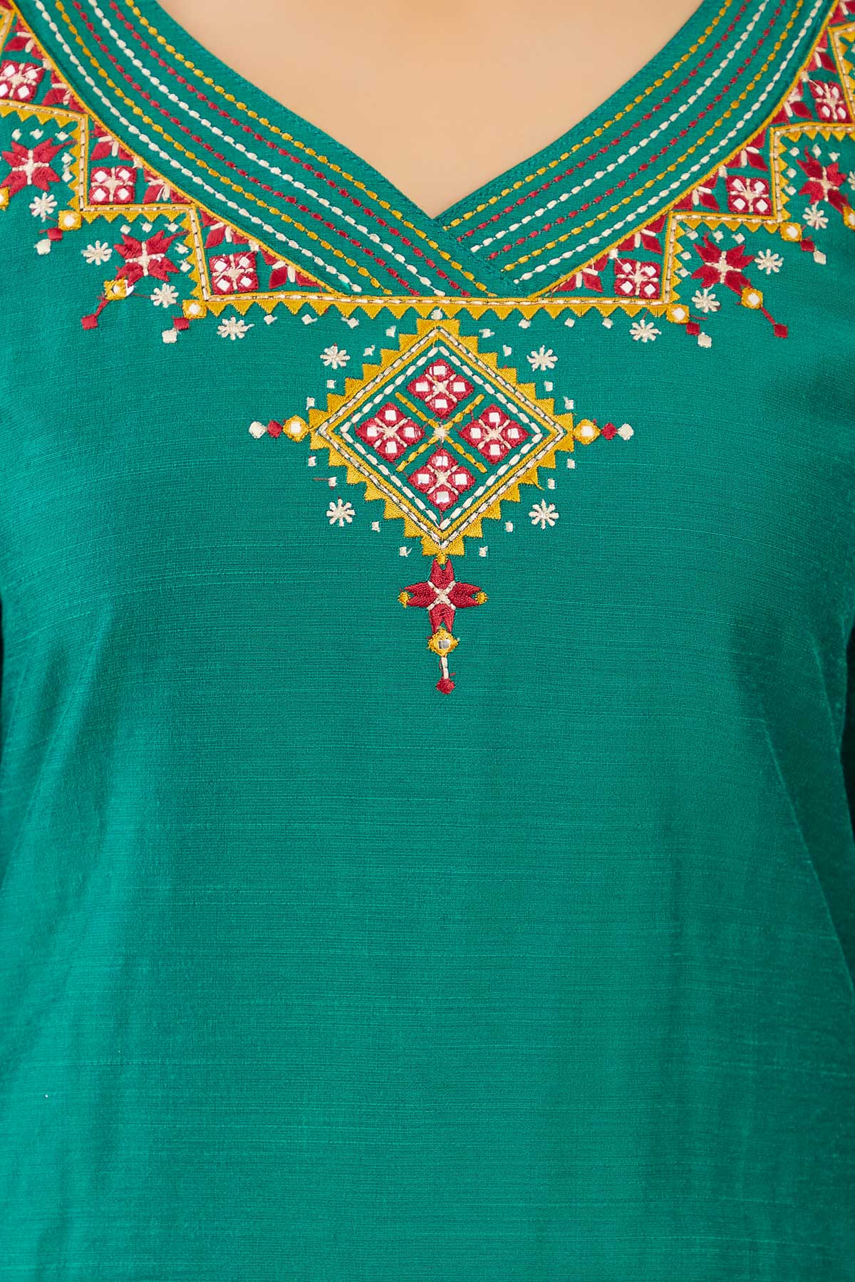 Contrast Tribal Motif Embroidered Kurta - Green