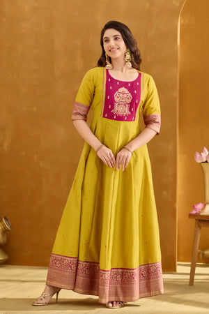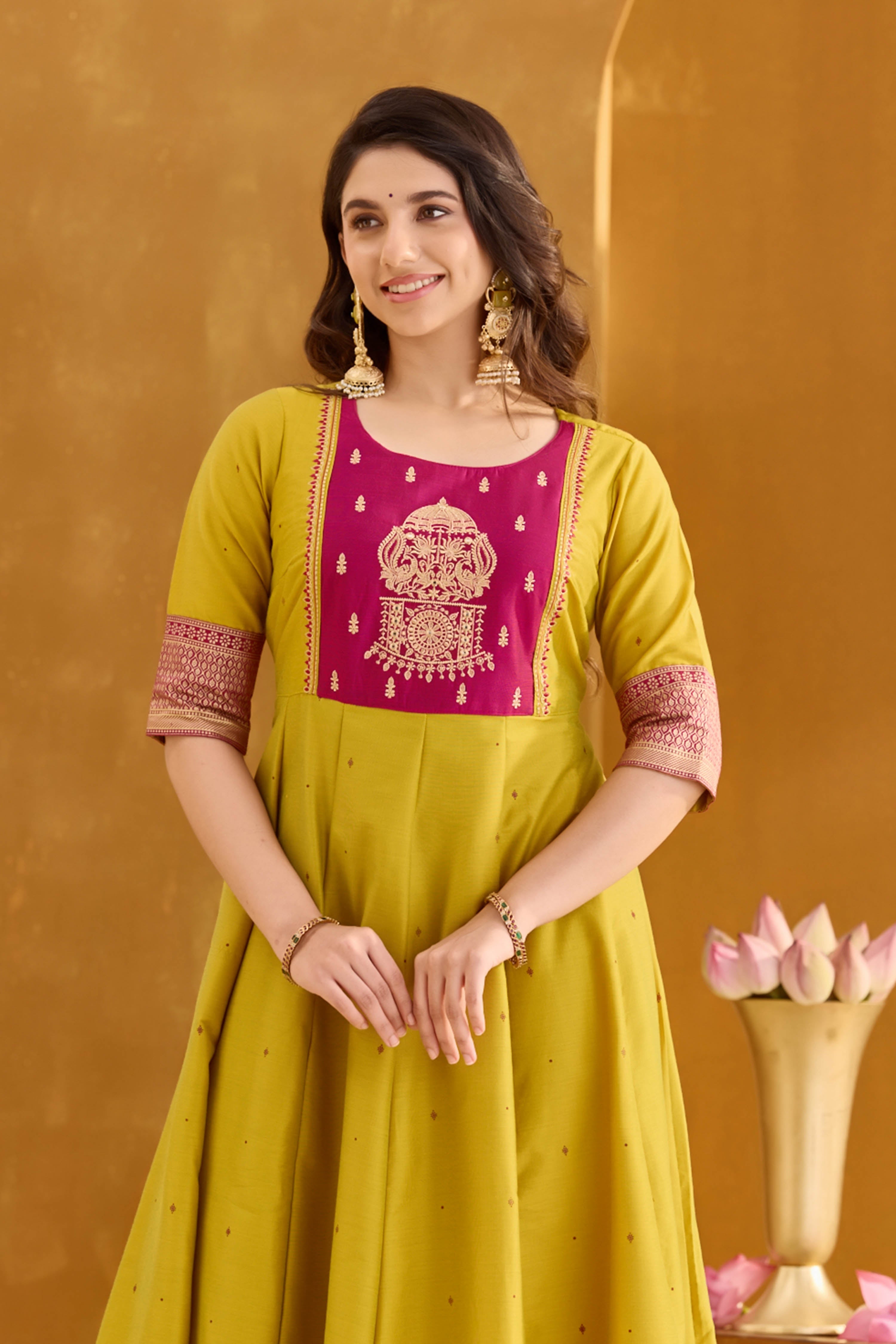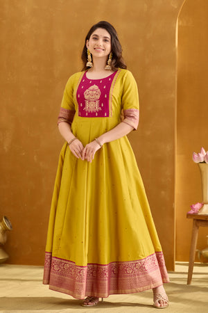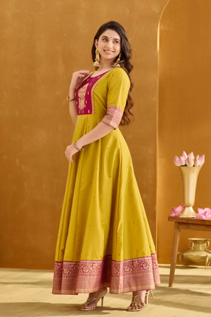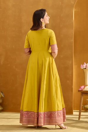 Lemon Green Anarkali with Muthukuda Embroidery Yoke & Brocade Border