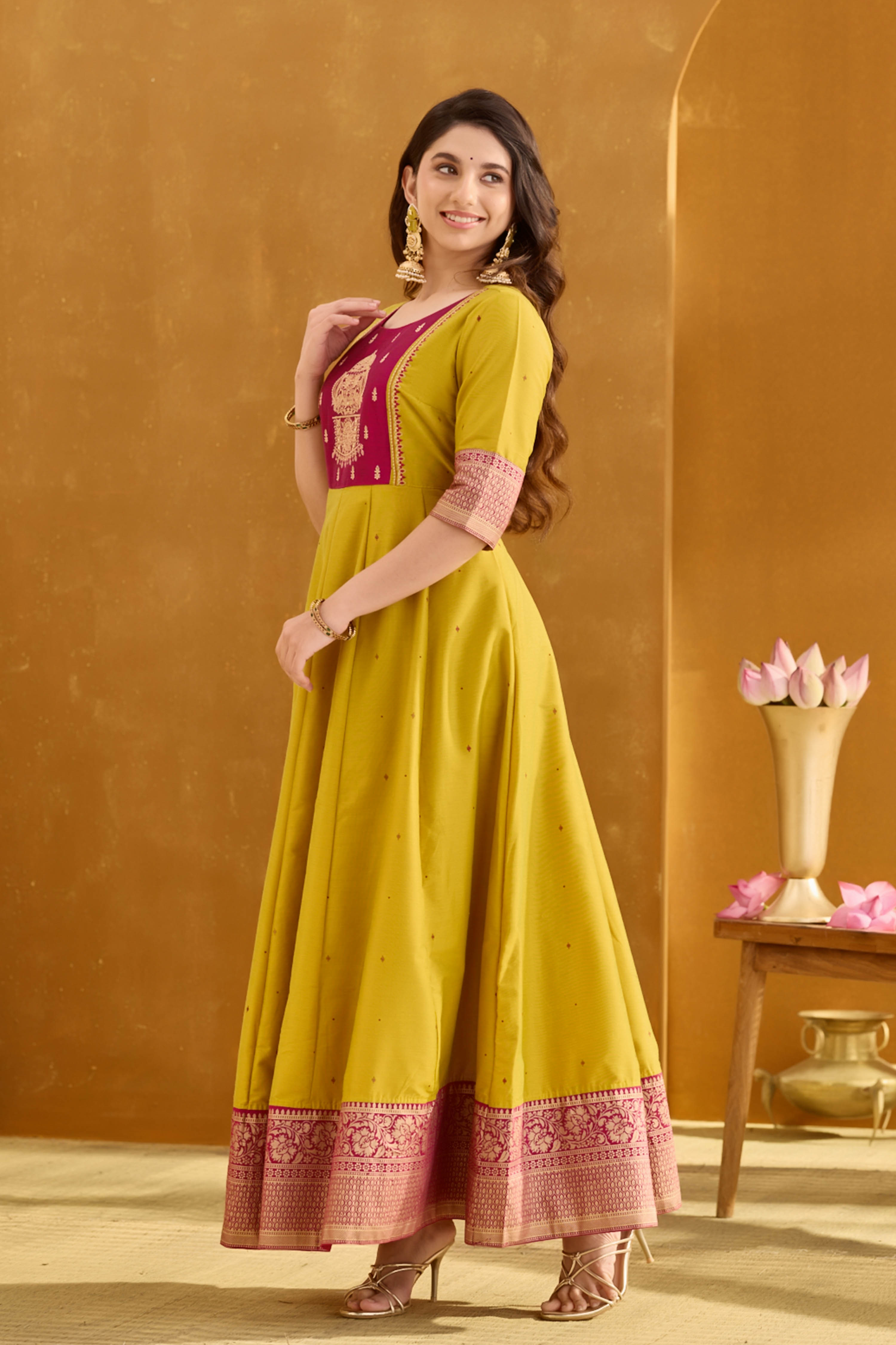 Step into festive charm with this lemon green Anarkali. Adorned with intricate Muthukuda embroidery and foil mirrors, it blends comfort with Diwali-ready elegance.