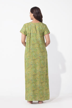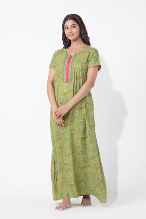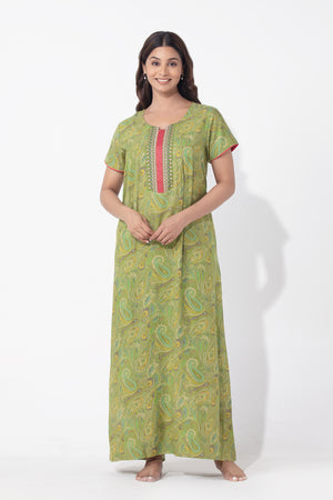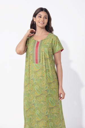 Monotone light green nighty in soft viscose with paisley prints all over, finished with a floral embroidered neckline—lightweight, breezy, and perfect for summer lounging.