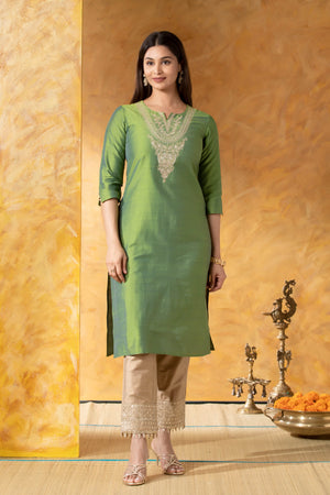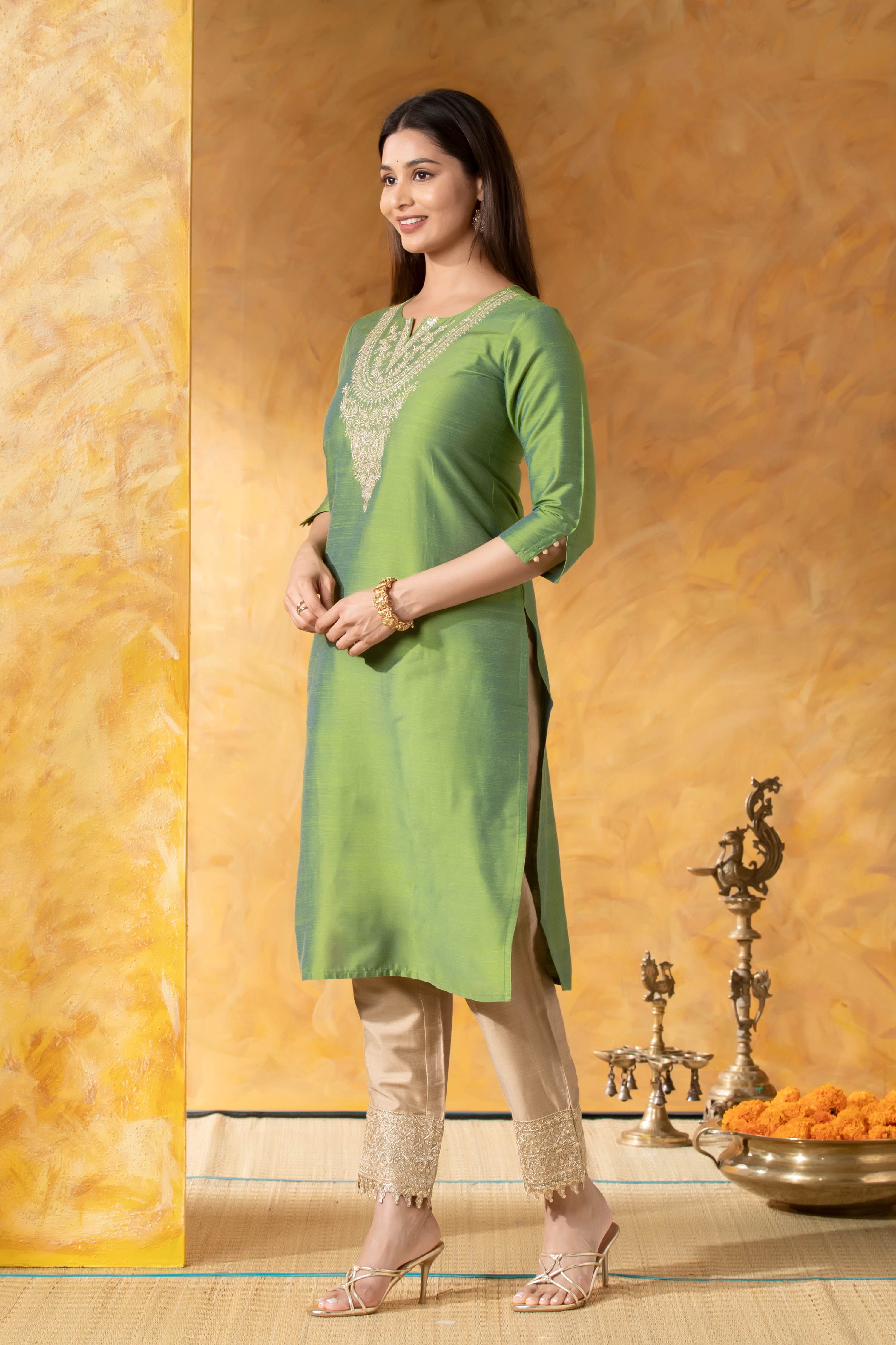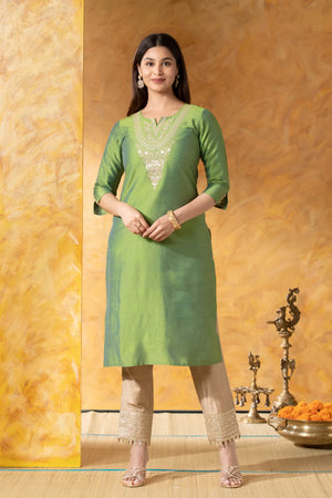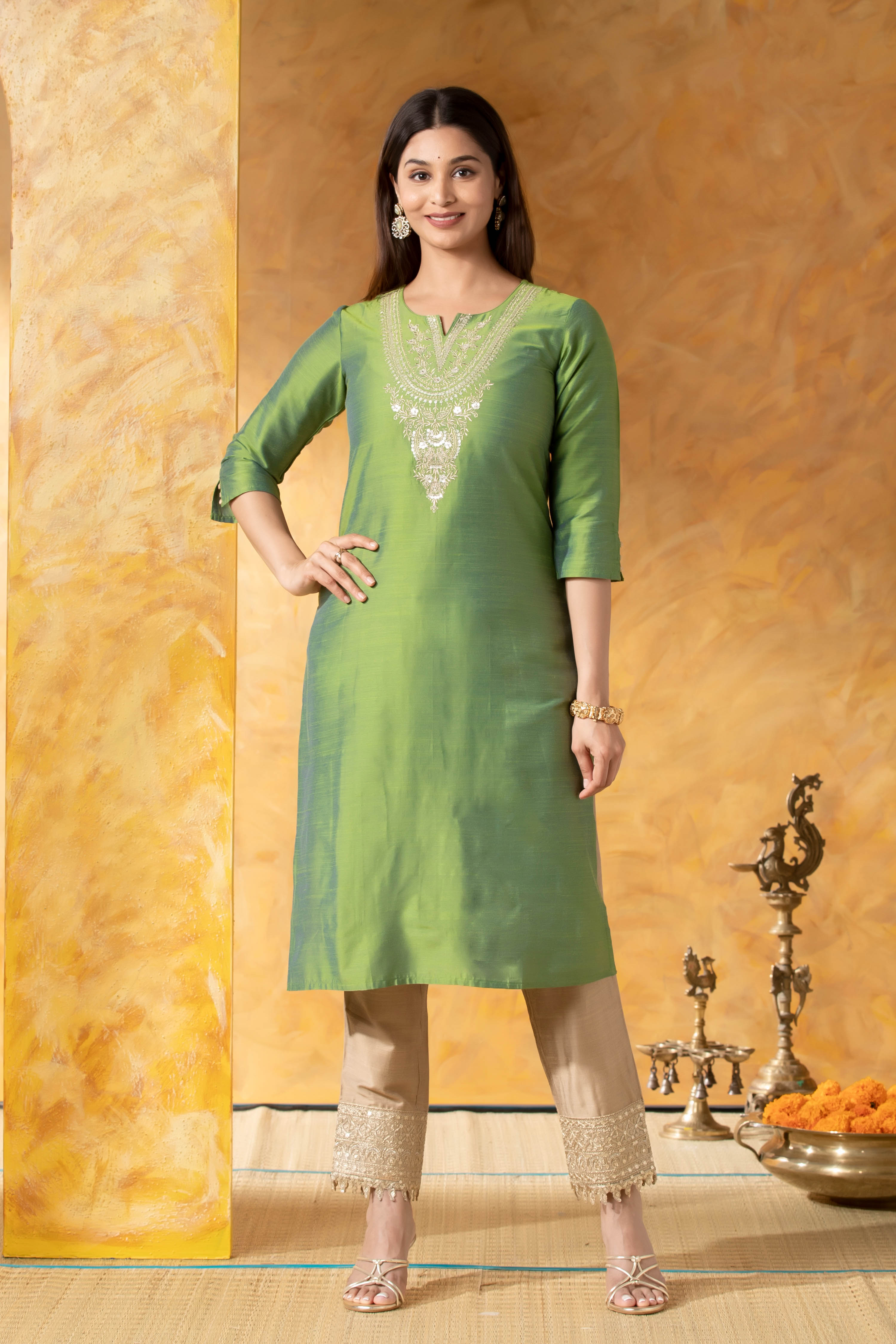 Elevate your festive look with this Light Green kurta featuring intricate embroidery and sequin work. Straight-line fit offers comfort and style, perfect for celebrations and special occasions.