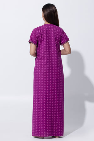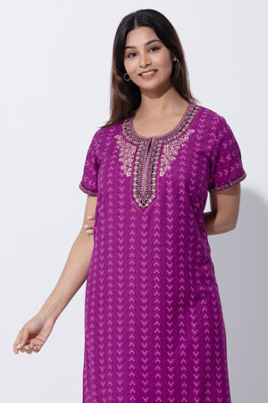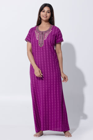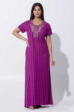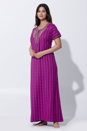 Magenta Dotted Chevron Printed Nighty with Embroidered Yoke & Foil Mirror Work