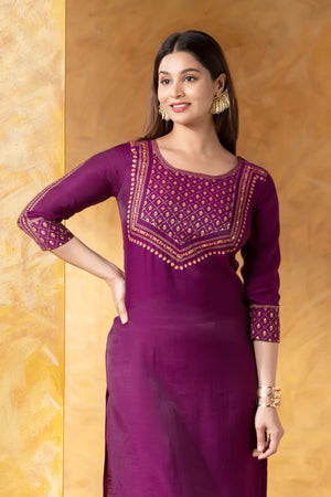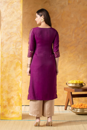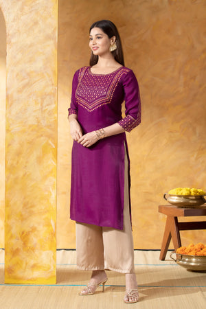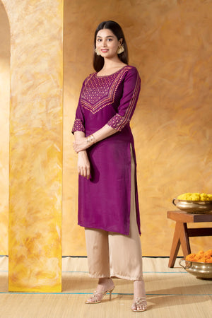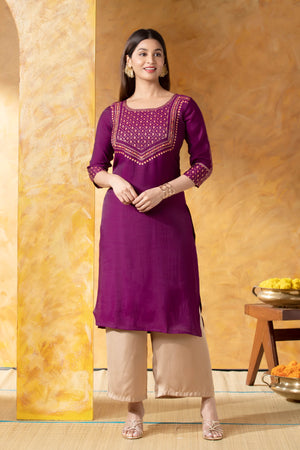 Brighten your festive look with this magenta straight-line kurta, adorned with printed detailing and foil mirror work. Designed with a round neck and 3/4th sleeves in soft viscose fabric, it offers style and comfort for Diwali celebrations.