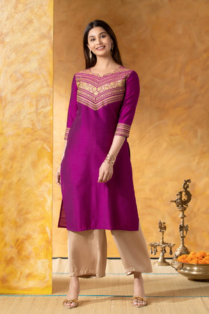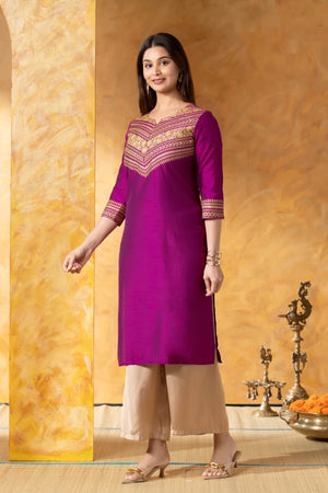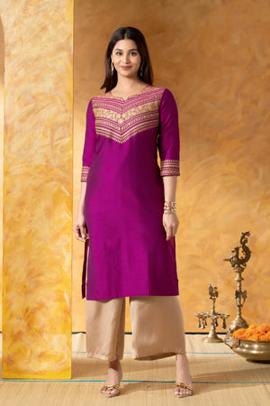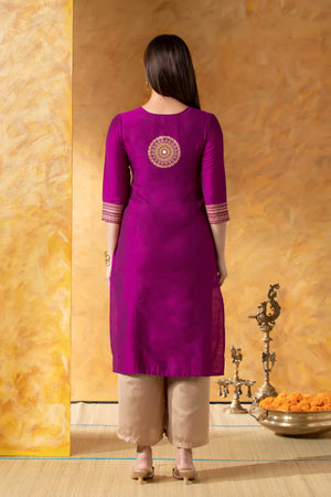 Magenta straight Kurta with Printed & Foil Mirror Work