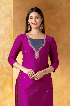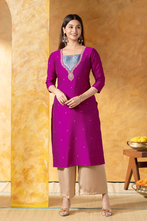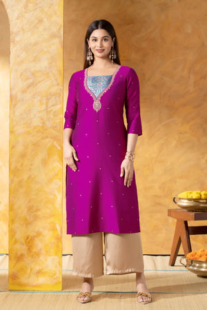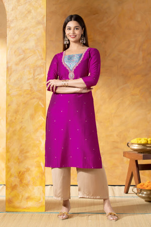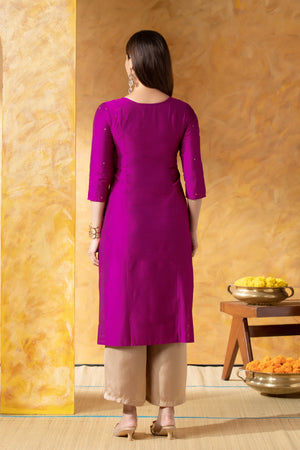 Magenta Straight Line Kurta with Embroidery, Foil Mirror Work & Brocade Yoke