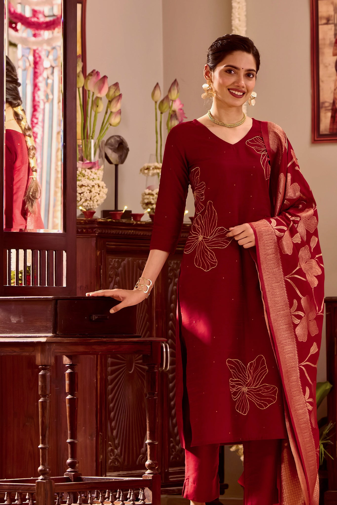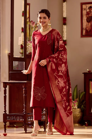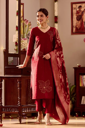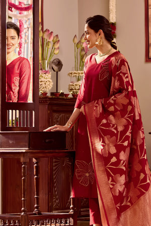 Maroon Kurta Set with Golden Threadwork & Brocade Dupatta