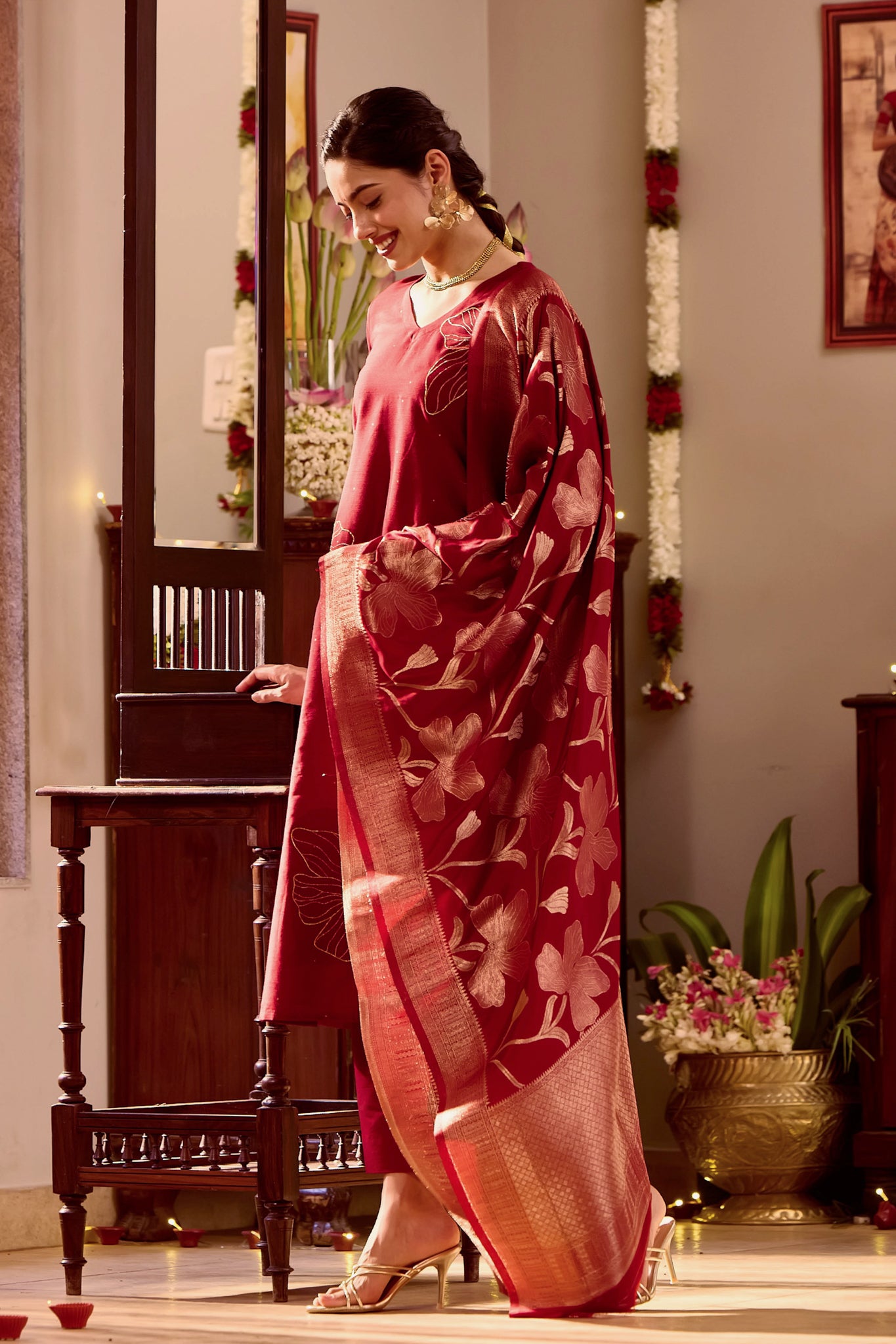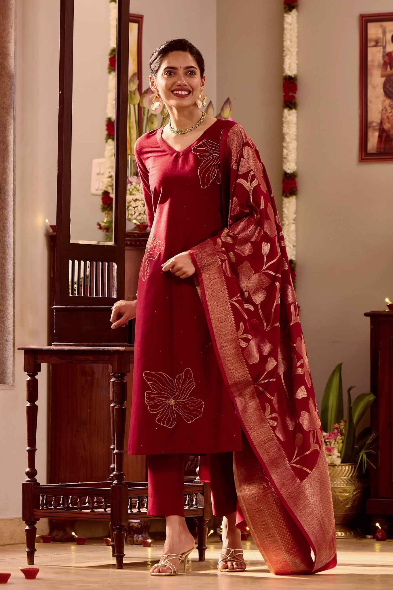 Celebrate Diwali in elegance with this maroon kurta set, featuring golden threadwork, sequins, and foil mirror. Styled with a brocade dupatta, it’s perfect for festive sparkle.